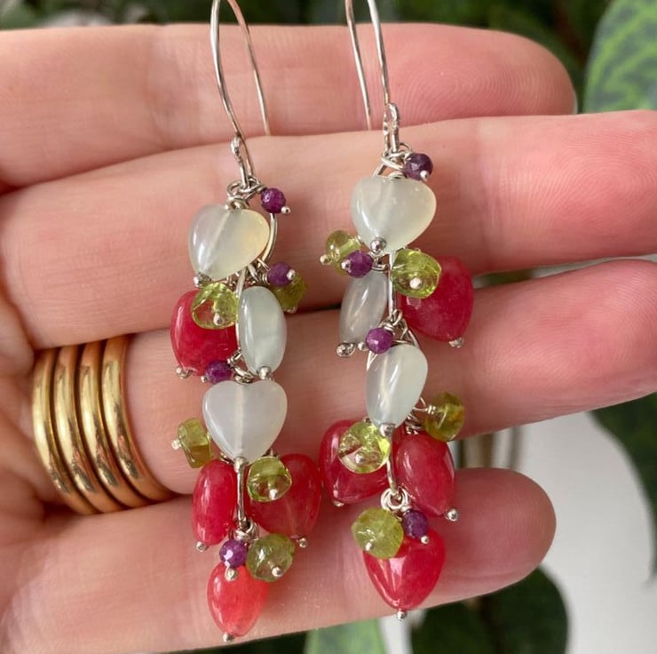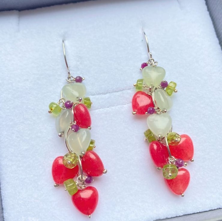 Stunning gemstone earrings made from gorgeous greens and pinks. Lovely green serpentine and red quartzite hearts mix beautifully with bright peridot and rubies.
