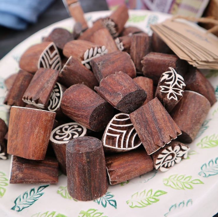 Our Indian wooden printing blocks are hand carved on a Fairtrade project in Jaipur, India and are made using a sustainable wood known as Sheesham. The designs are traced and carved onto the wood. The blocks are then left to soak in mustard oil for several days, this preserves the wood making it non-absorbent. Indian blocks are by design, very traditional and we wanted to introduce blocks with a more contemporary look as well as stocking the original designs you see in Indian carving workshops.