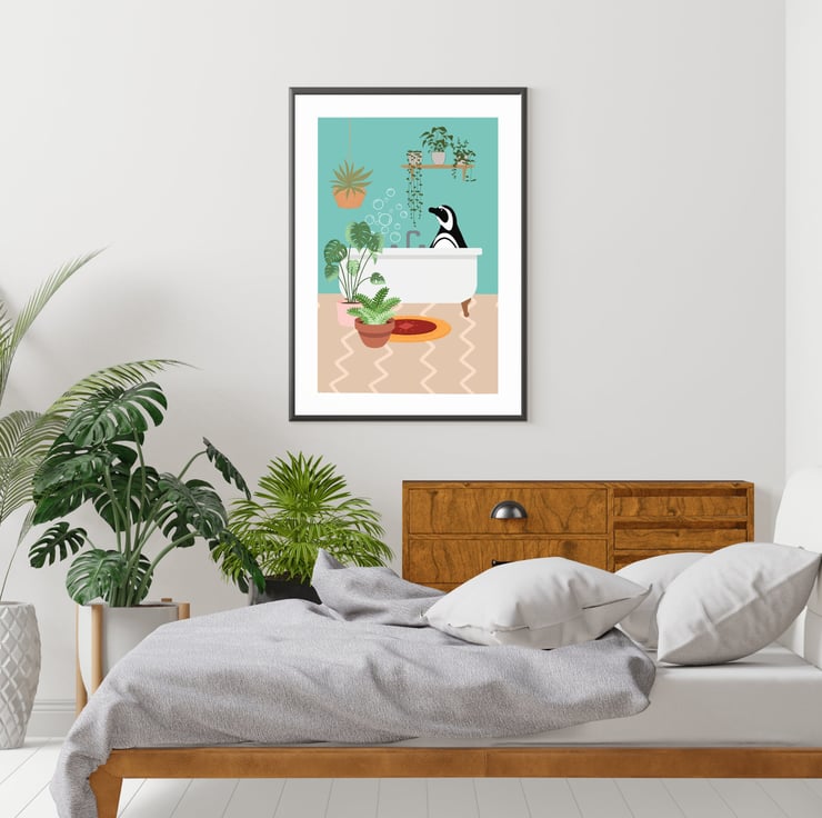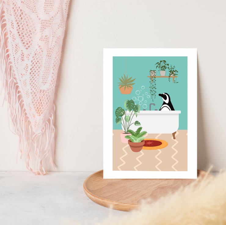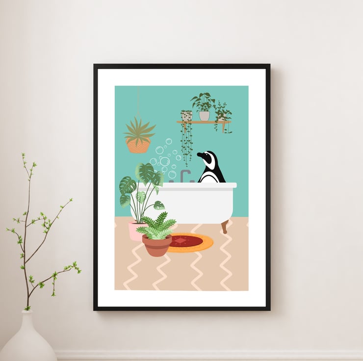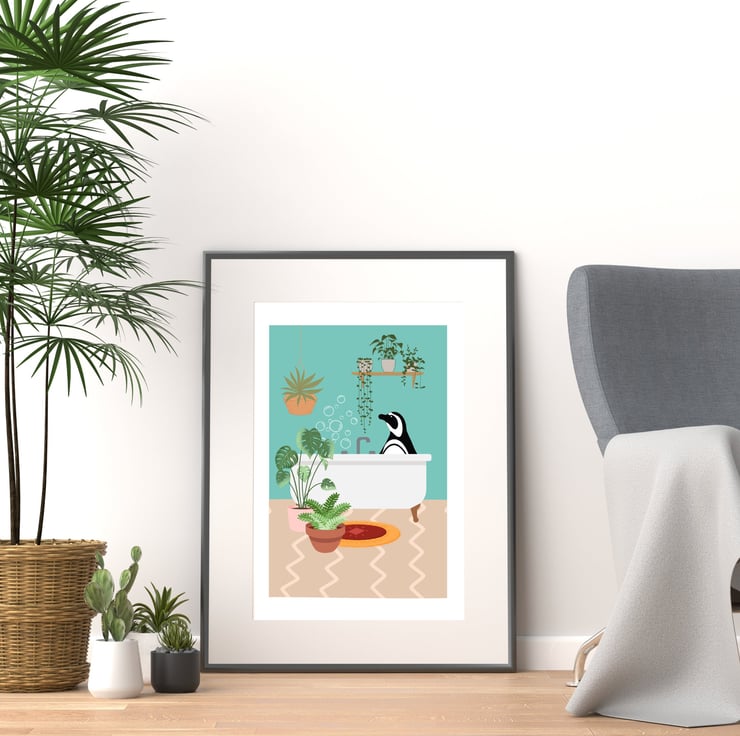 Introducing a Penguin in Bathtub art print, thoughtfully crafted by Baba Boop. This print boasts a funky and stylish vibe, making it a versatile addition to any room, with a special flair for kitchens, hallways, and living spaces.