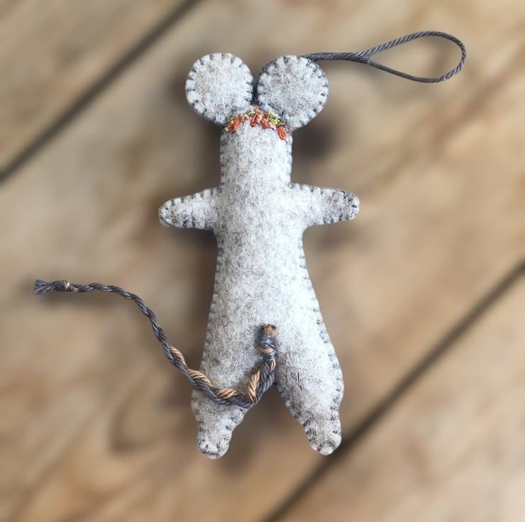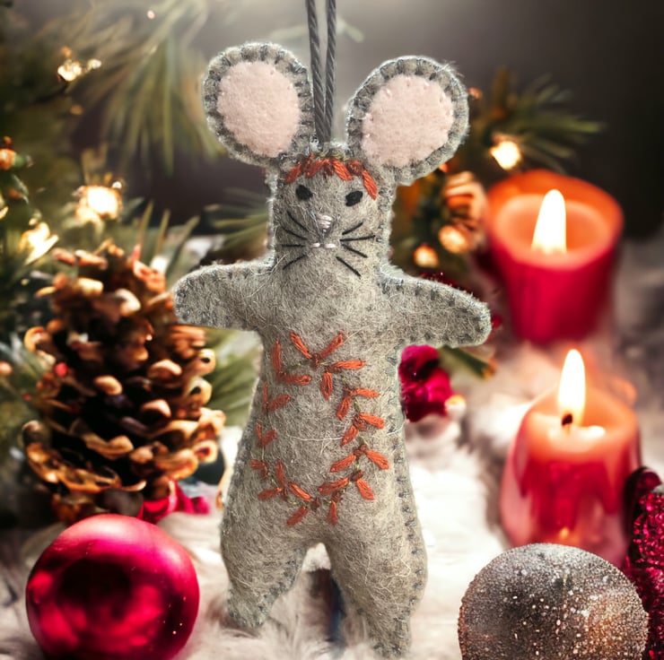 This unique Christmas hanging felt gift is made using my own design , pattern and free style embroidery ideas. This mouse is made from 100% natural wool felt - so no nasty chemicals