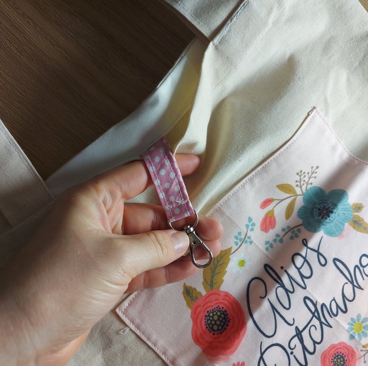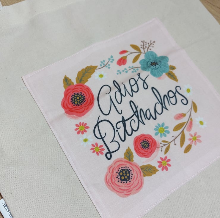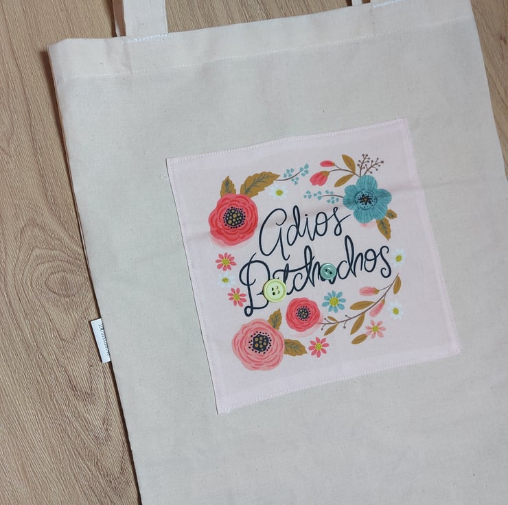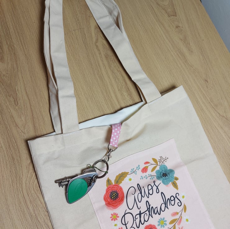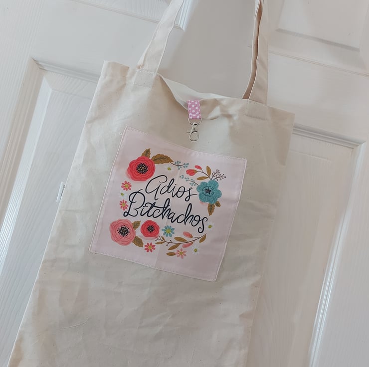 This is a one of a kind calico tote bag with a lovely motivational quote front and centre reading '' adios b-tchachos '' surrounded by wild flowers , these totes make brilliant gifts for your friends and family that like a little sass with their sustainable shopping , inside is a pink polka dot key clip so we can avoid those moments when we are rooting around the bottom of our bags hunting for them .
