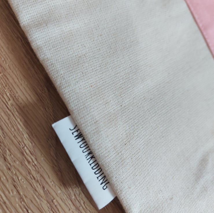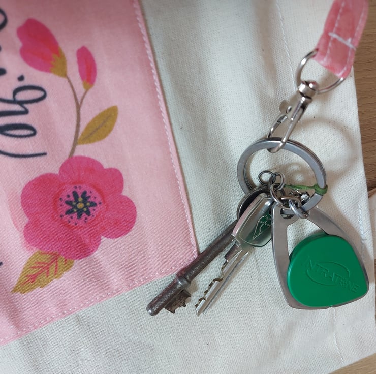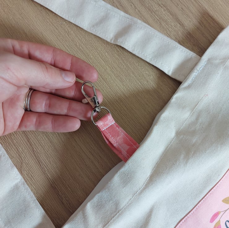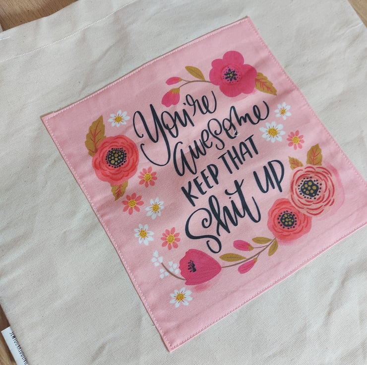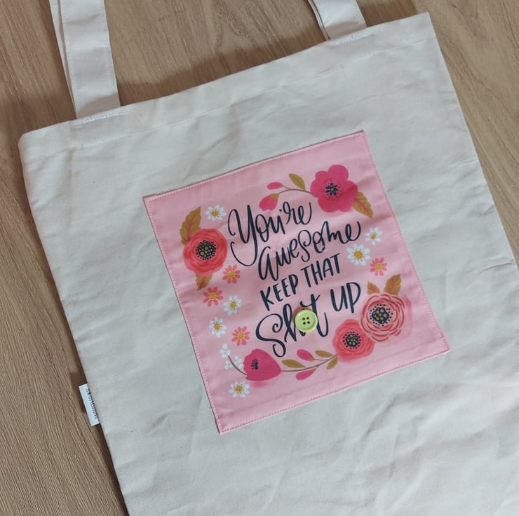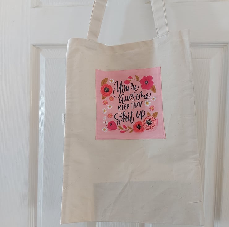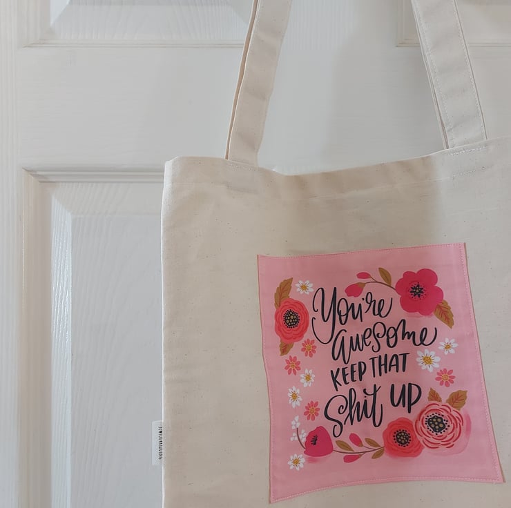 This is a one of a kind calico tote bag with a lovely motivational quote front and centre reading '' your auesome keep that sh-t up '' surrounded by wild flowers , these totes make brilliant gifts for your friends and family that like a little sass with their sustainable shopping , inside is a pink key clip so we can avoid those moments when we are rooting around the bottom of our bags hunting for them .