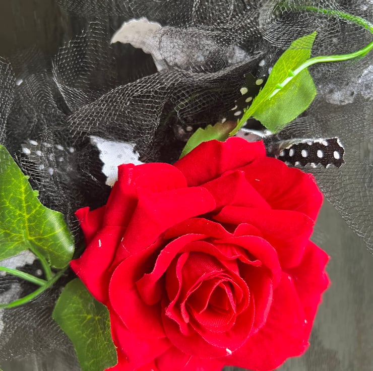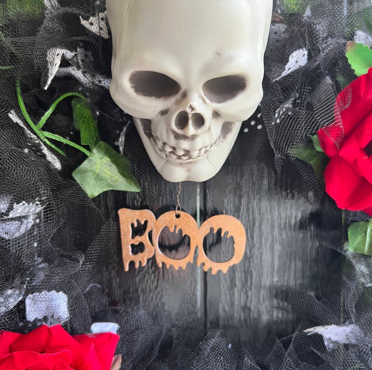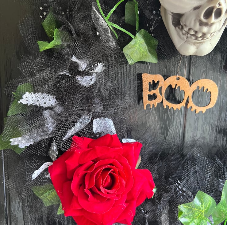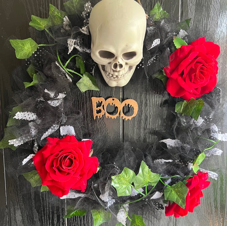 Handmade Halloween wreath, blood red roses, spooky skull and a sign saying Boo!