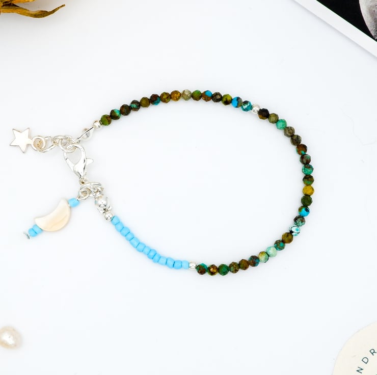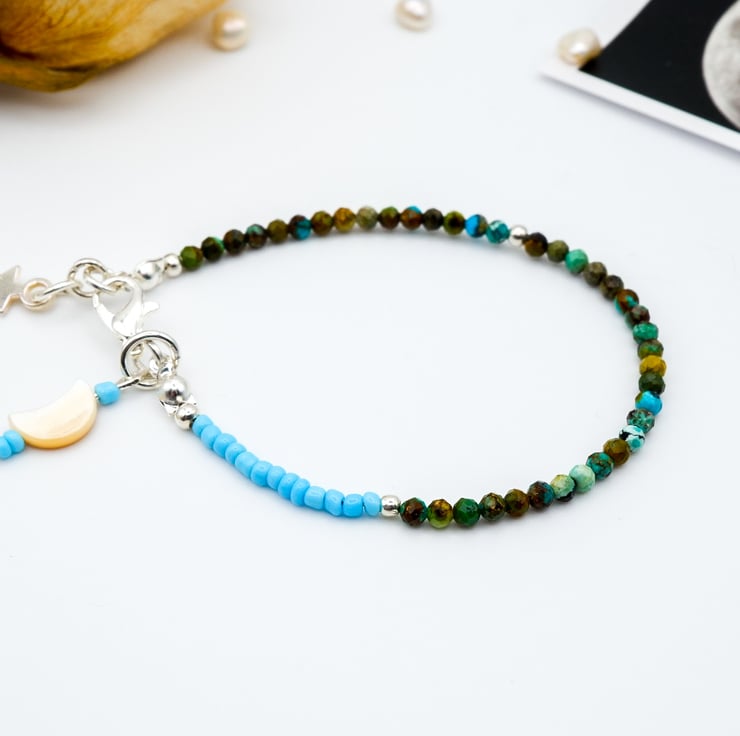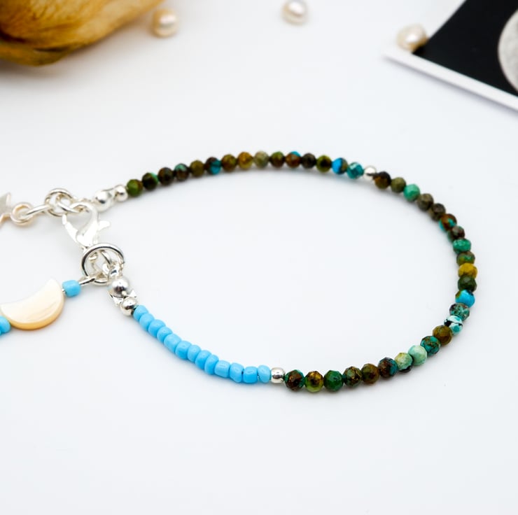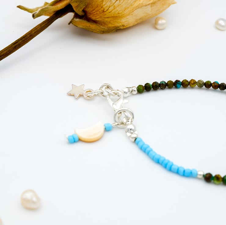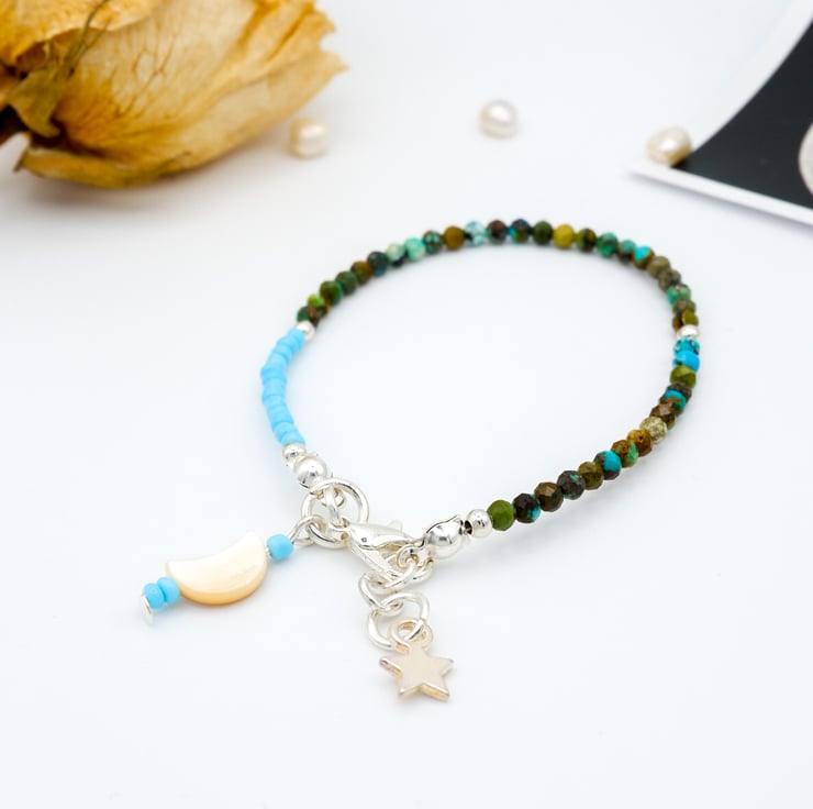We've combined African turquoise gemstone beads, known for their vibrant hue and believed to bring wisdom and protection, with sterling silver accents and a pretty, dainty silver star charm for a starry night sky vibe.