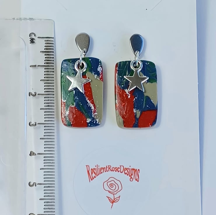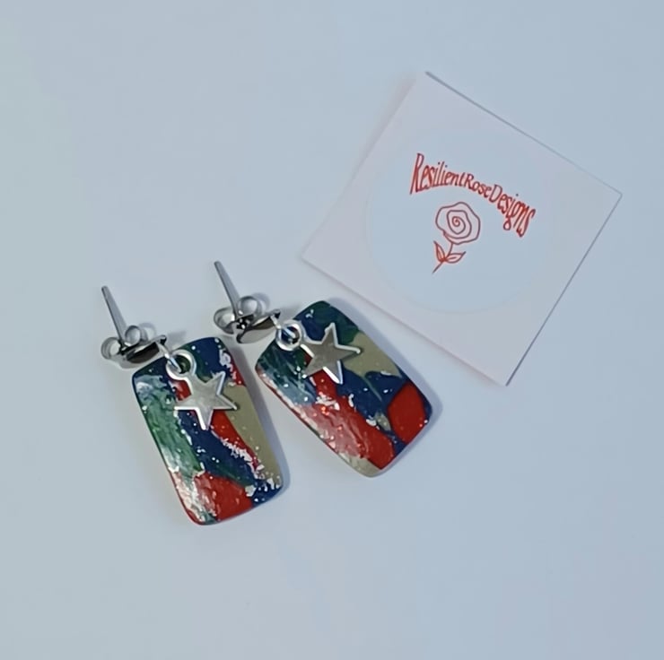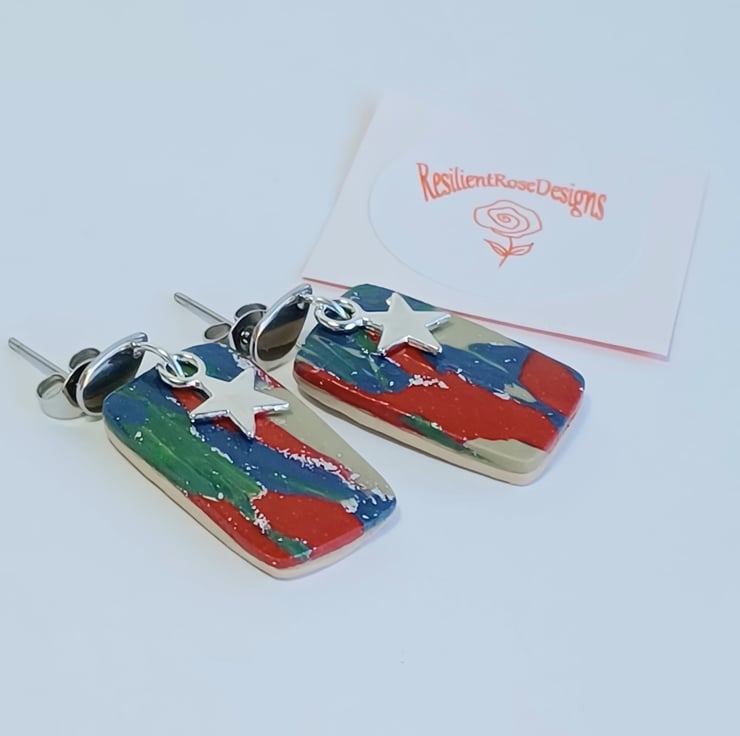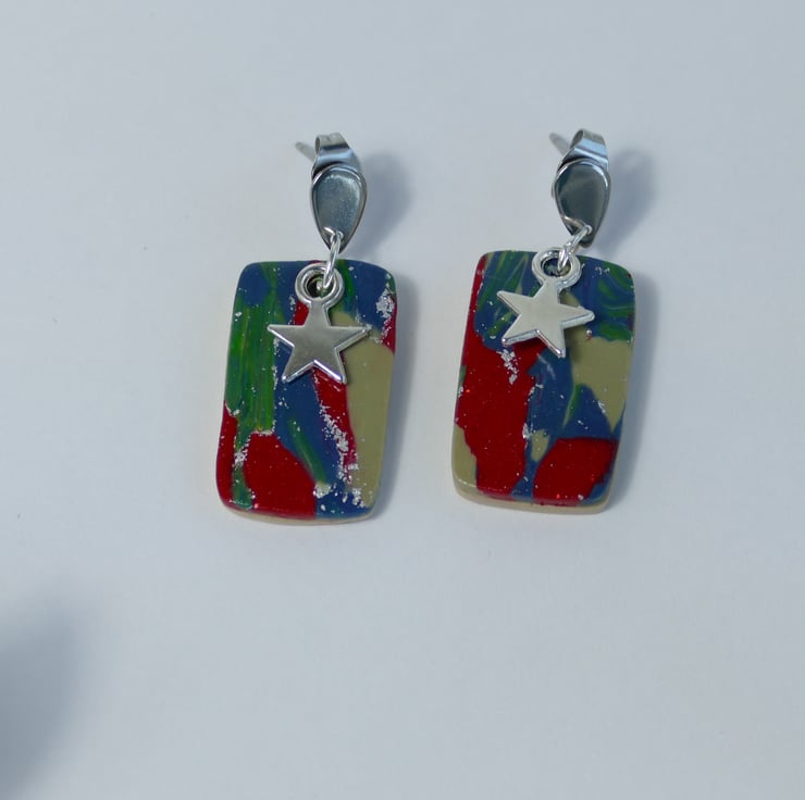 These red, green and blue rectangle dangle earrings were handmade from a special blend of polymer clay. They come with stainless steel studs with butterfly backs and a silver star charm and metallic silver flakes, They are a one of a kind item and are ready to post.