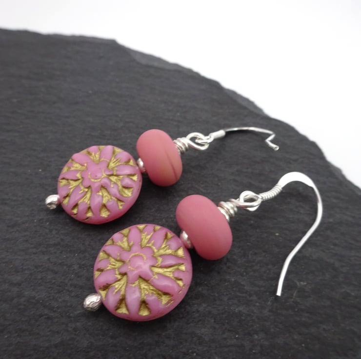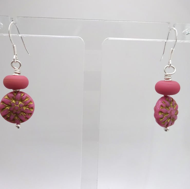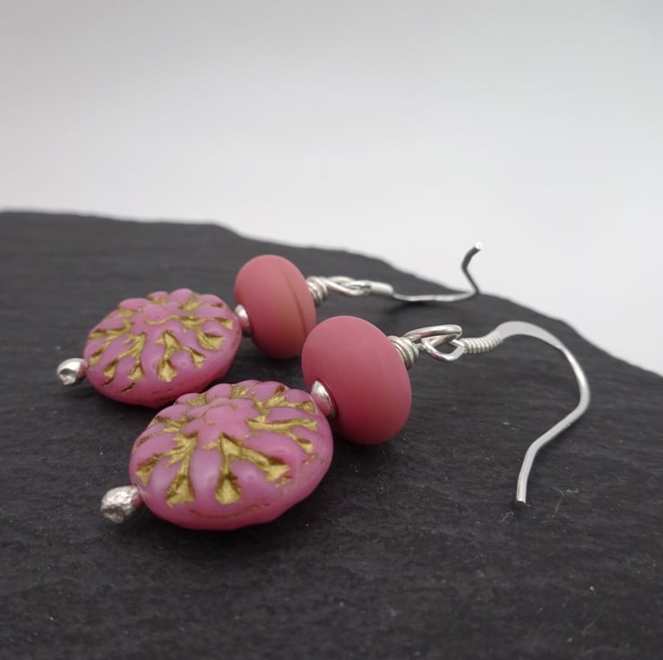 A pair of earrings made with sterling silver ear wires, sterling silver beads, handmade lampwork glass beads and Czech glass pink dahlia beads.