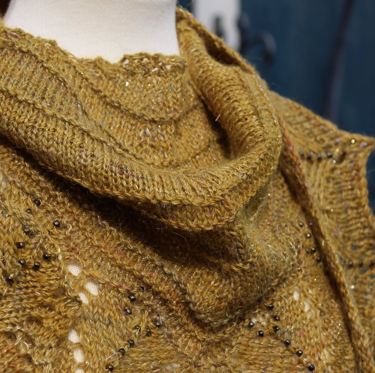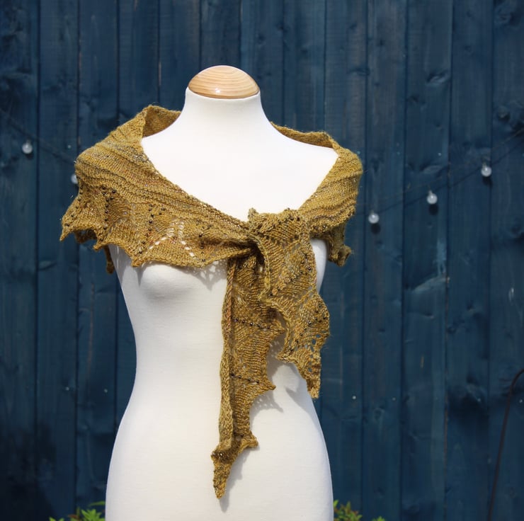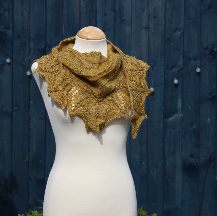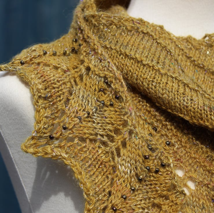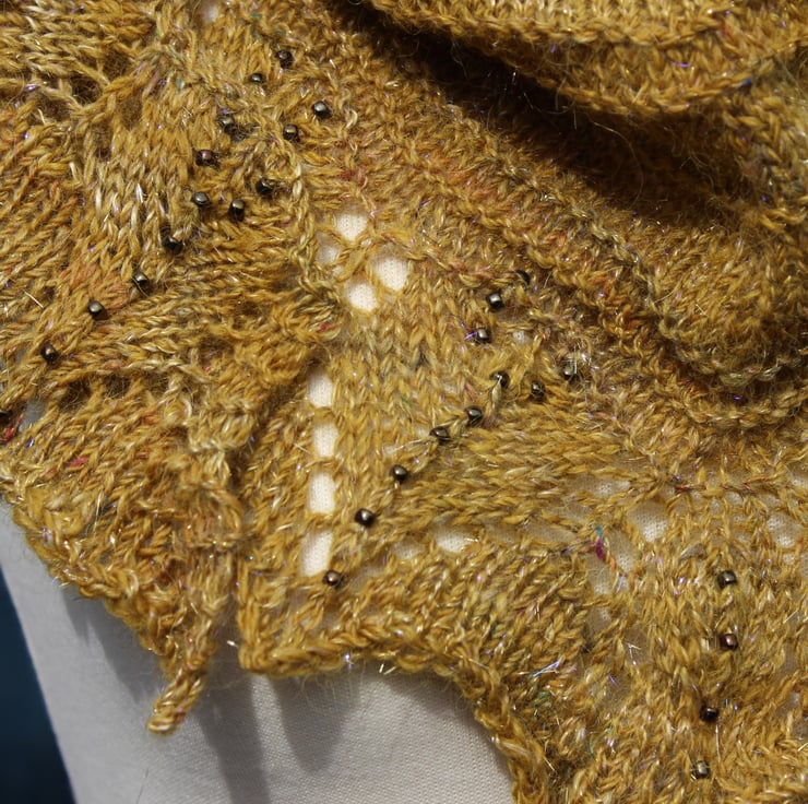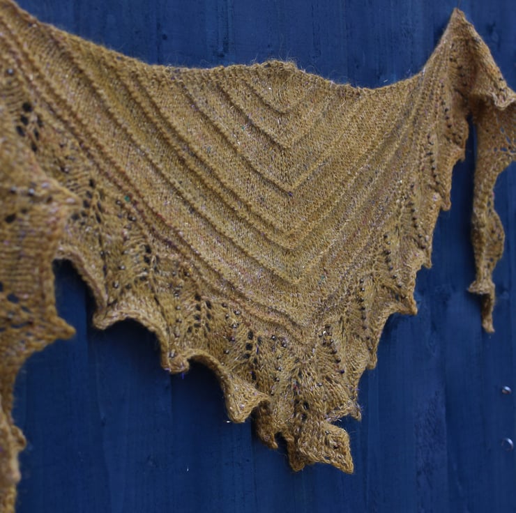 This long shallow triangular shawl has been knit by me using yarn that I hand spun myself in September 2018 from fleece and fibre that I dyed from carrot tops grown in my garden. It has lace edging set off with complementing glass beads.