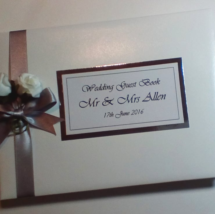 This Wedding Guest Book is decorated with embellishments and a ribbon.
