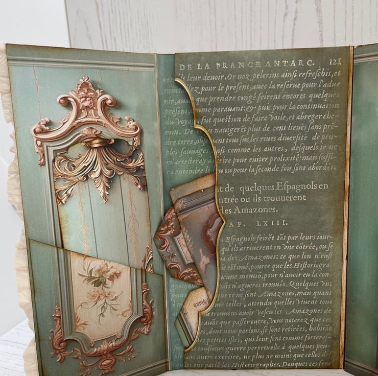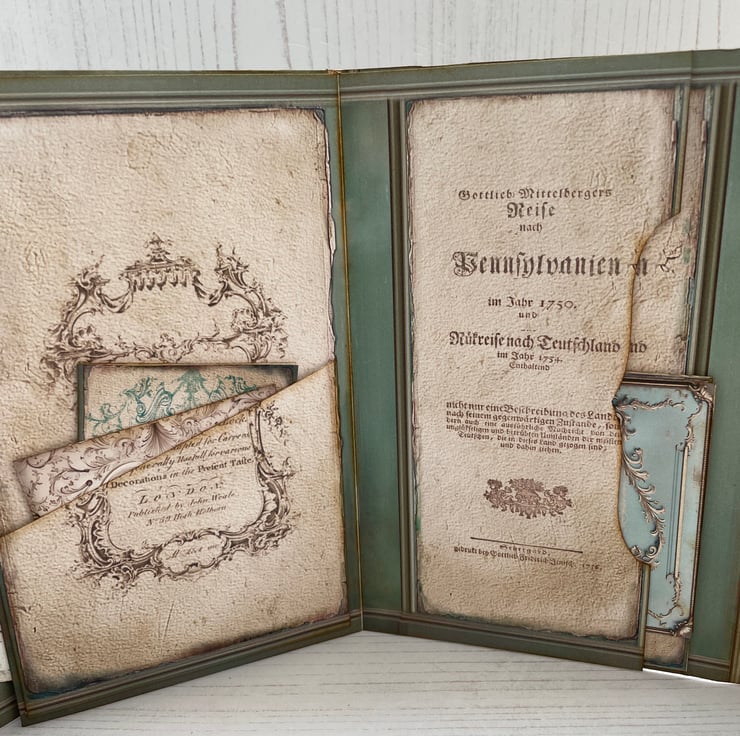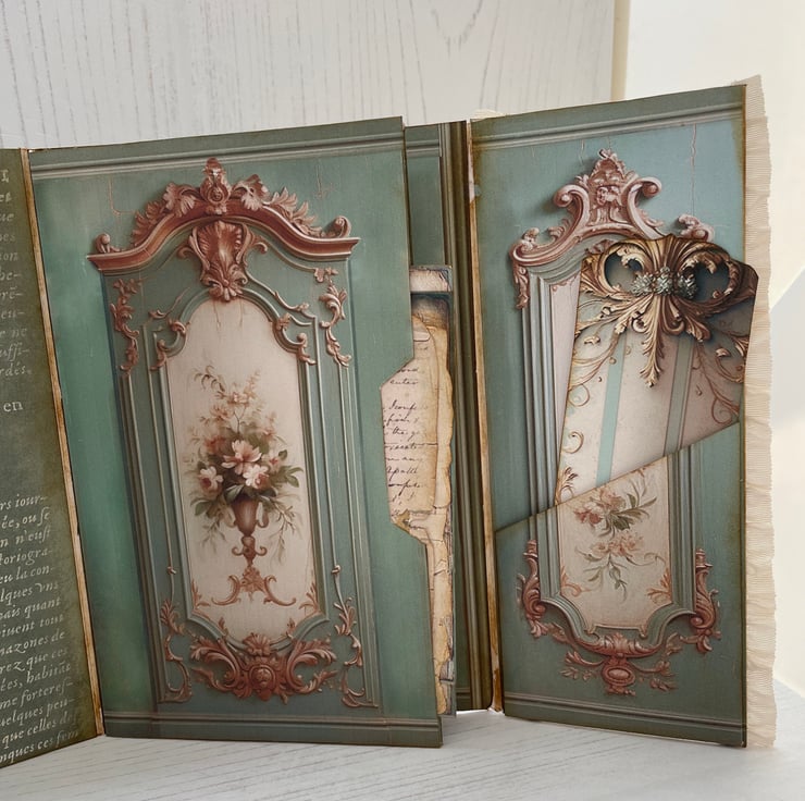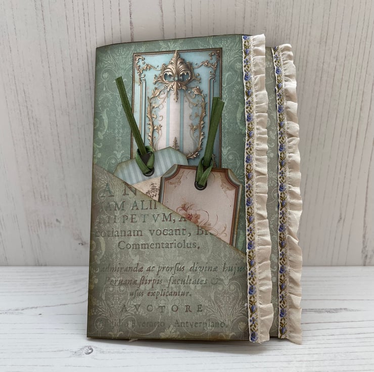 Beautiful green wardrobe printed papers, made into a flip folder. Pocket with 2 tags on the front cover. Opens to a pocket on the first flip, another pocket. Large pocket with ephemera. Side pocket with vintage style papers. Three more pockets. Hook and loop closure. With embroidery gathered ribbon on the edges.