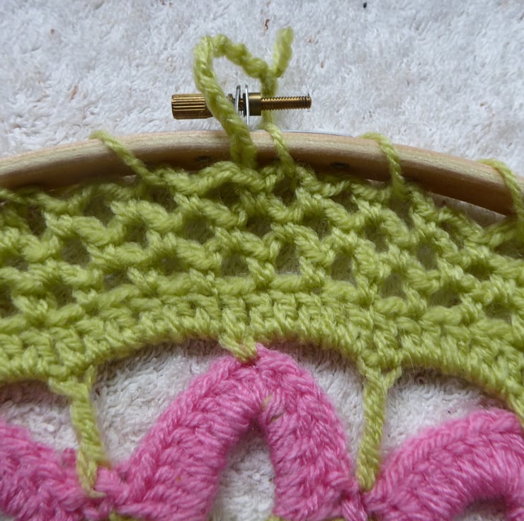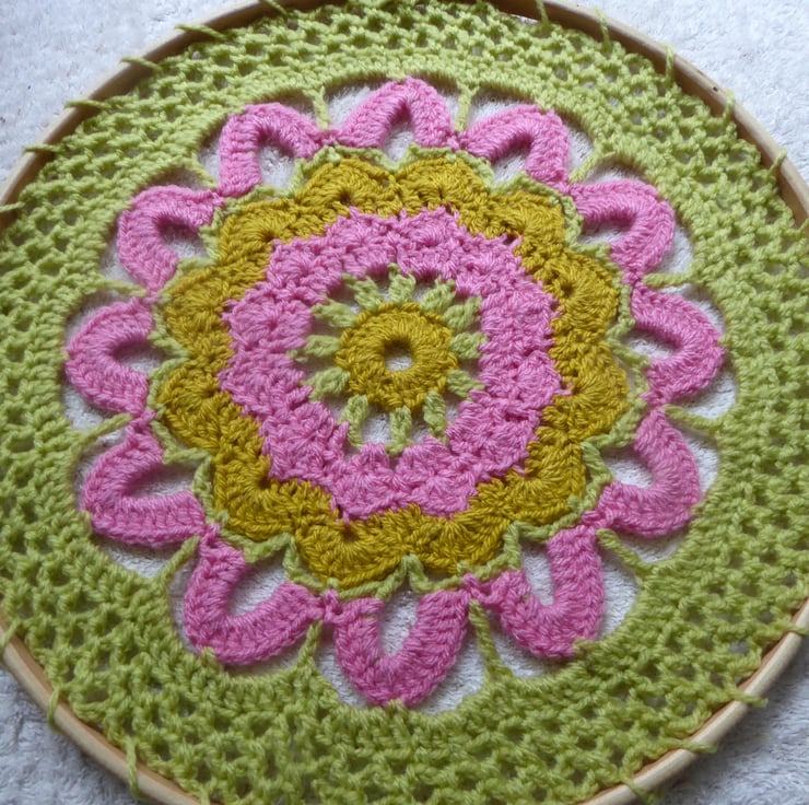 Handmade 12 inch Crochet Wall Hanging in a beechwood hoop