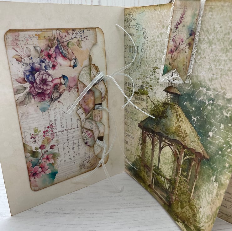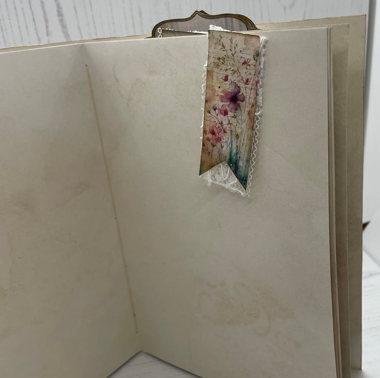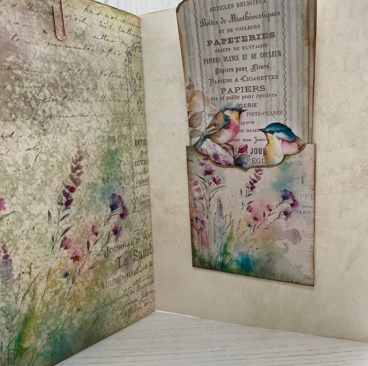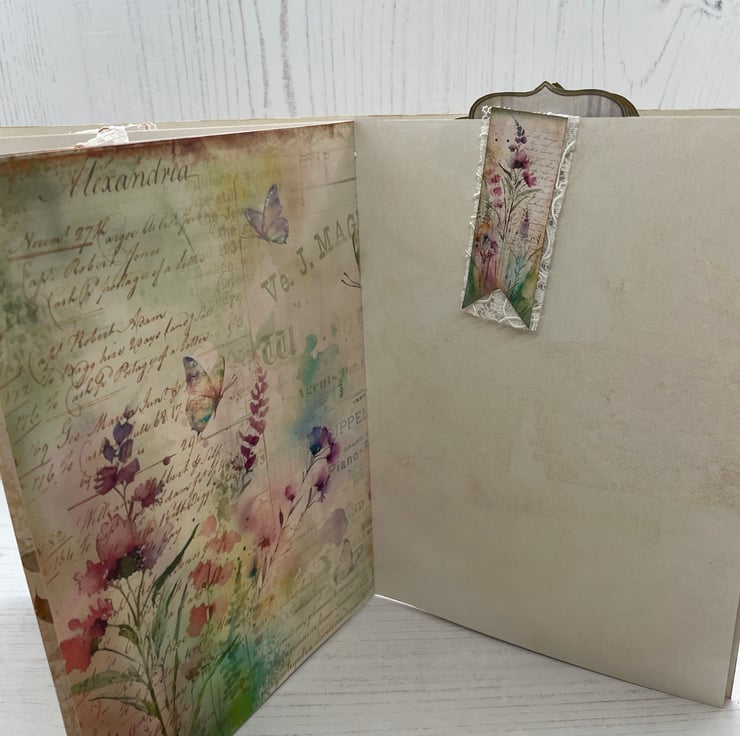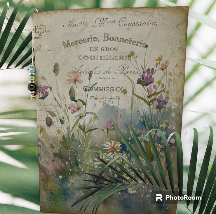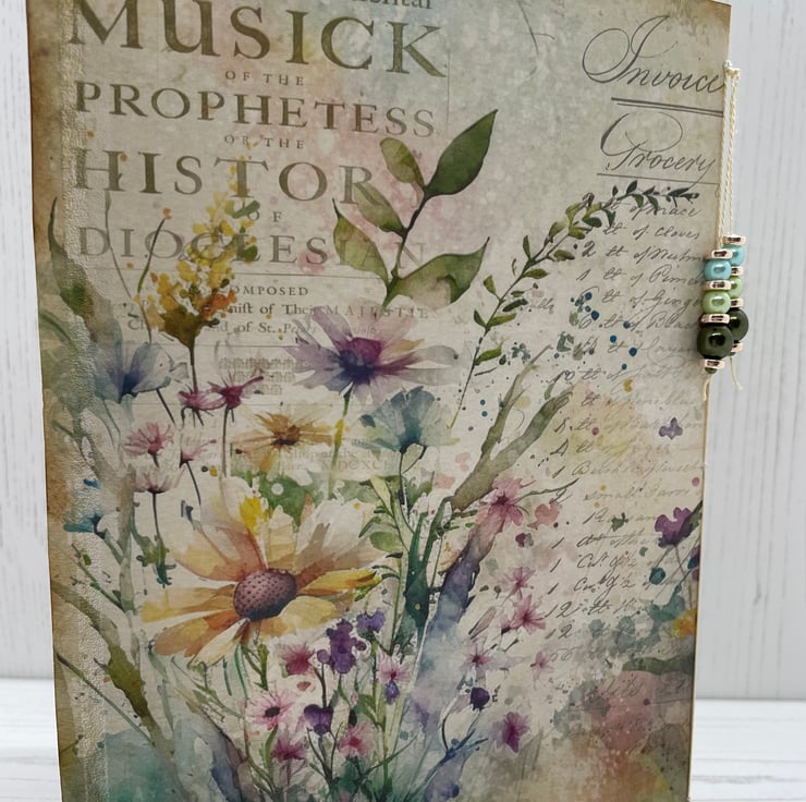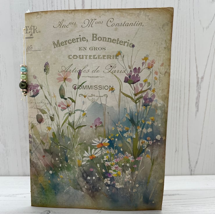 French script and spring wild flowers printed papers with coffee stained backing. 16 pages hand stitched onto a pretty printed card cover. Green pearls and rose gold beads hanging from the spine stitching. Pocket inside front cover with ephemera. 8 design printed pages. Hidden paper clips and a pocket on the inside back cover with ephemera and bookmarks. Ideal as a starter journal or special notebook of a mini holiday.