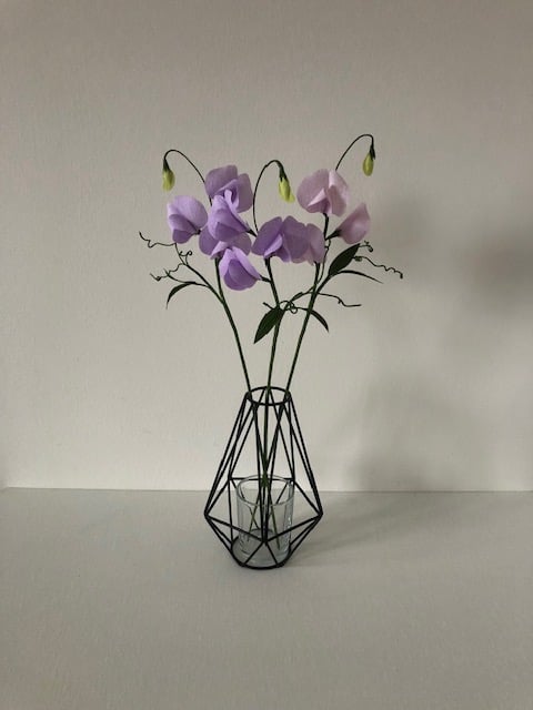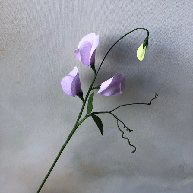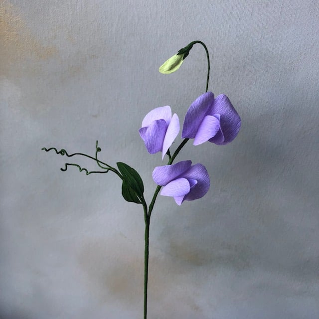 An elegant crepe paper sweet pea stem complete with flowers, tendril and leaves, handcrafted from the highest quality, FSC-certified crepe paper. The paper is hand painted with lightfast, artist-grade paint, then each part of the flower is cut, shaped and assembled by hand, making every flower unique. A lovely gift for a birthday or anniversary, or perfect for a wedding or for displaying in your home. Available in pale pink and pale lilac. Can also be made in any colour of your choice - please feel free to message me to discuss.