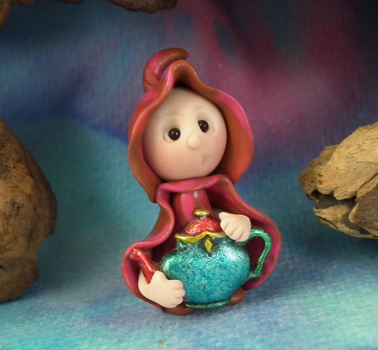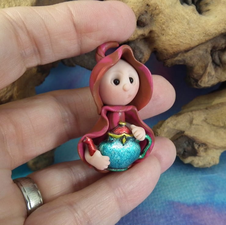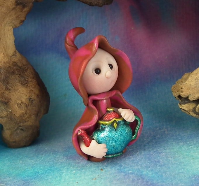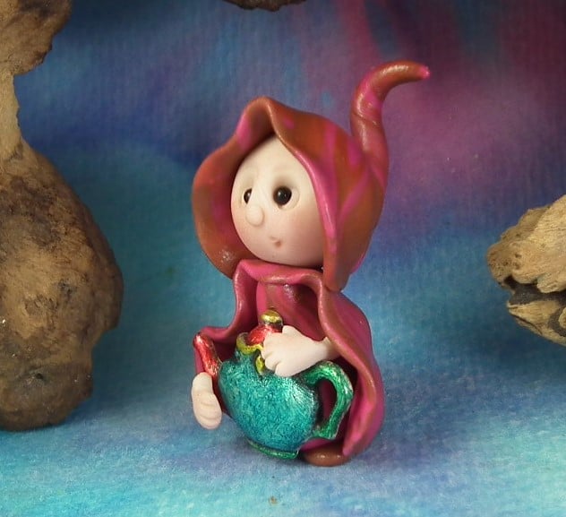 This is a 'one of a kind' creation having been entirely handmade without the use of moulds here at my studio on the Sussex Coast. Modelled with artist blend polymers, blushed before sealing with lacquer, Cally has sparkling black onyx eyes and handpainted teapot. Cally the Garden Gnome is just one and a half inches tall.