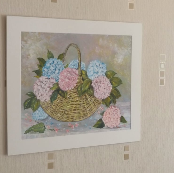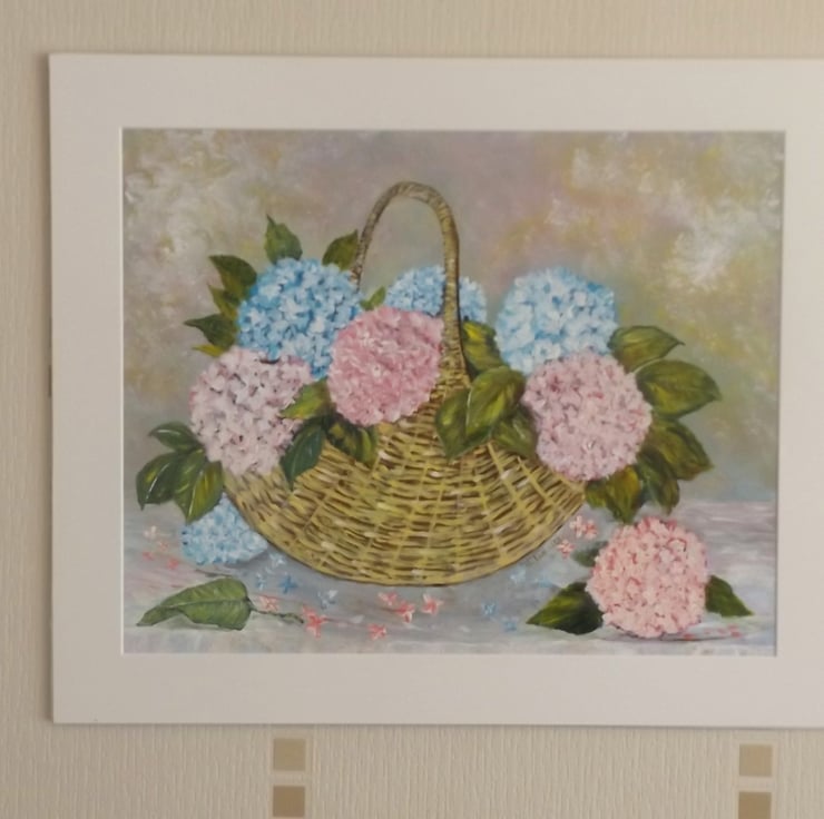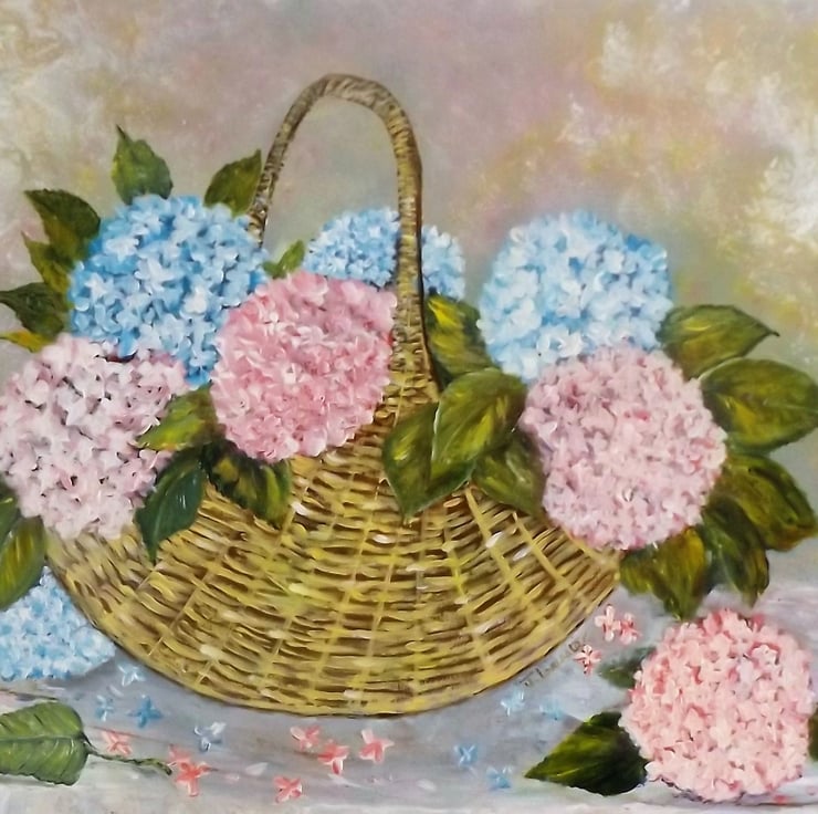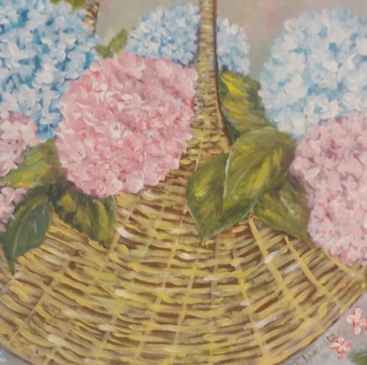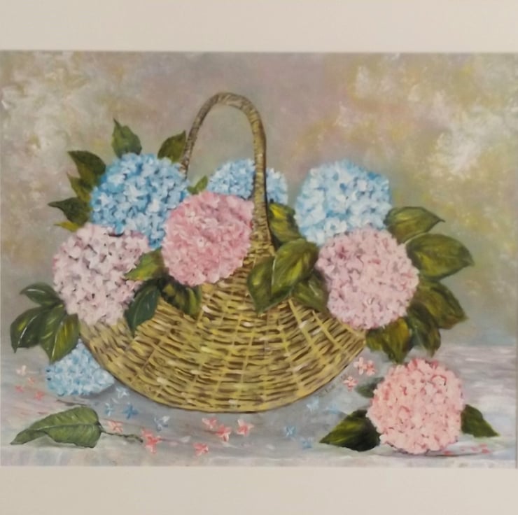 Pink and blue hydrangea flowers in a wicker basket painted in acrylic on a 20in x 24in canvas board, mounted and ready for you to put in a frame of your choice