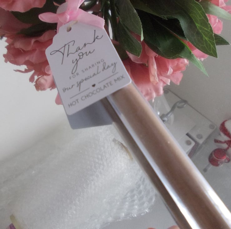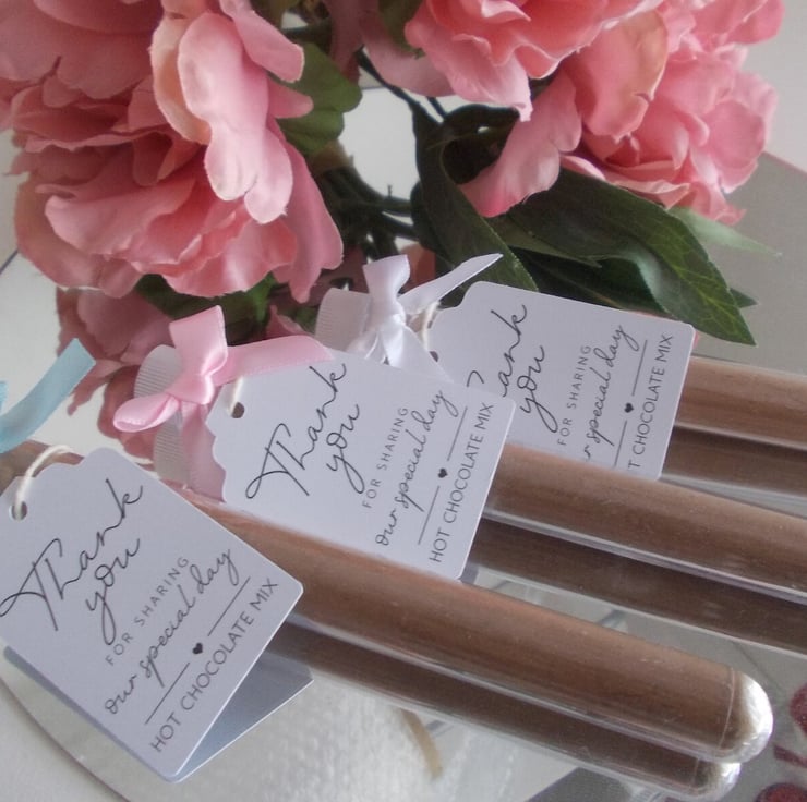 5 Hot chocolate wedding or party favour test tube. Filled with a luxury hot chocolate that can just be added to hot milk. Decorated with a bow in pink white or blue I can do in other colours and quantities just send me a message. Favours have a tag saying Thank you for sharing our special day but you can have custom made favours with different messages or personal details like names and dates message me to discuss your needs and prices.