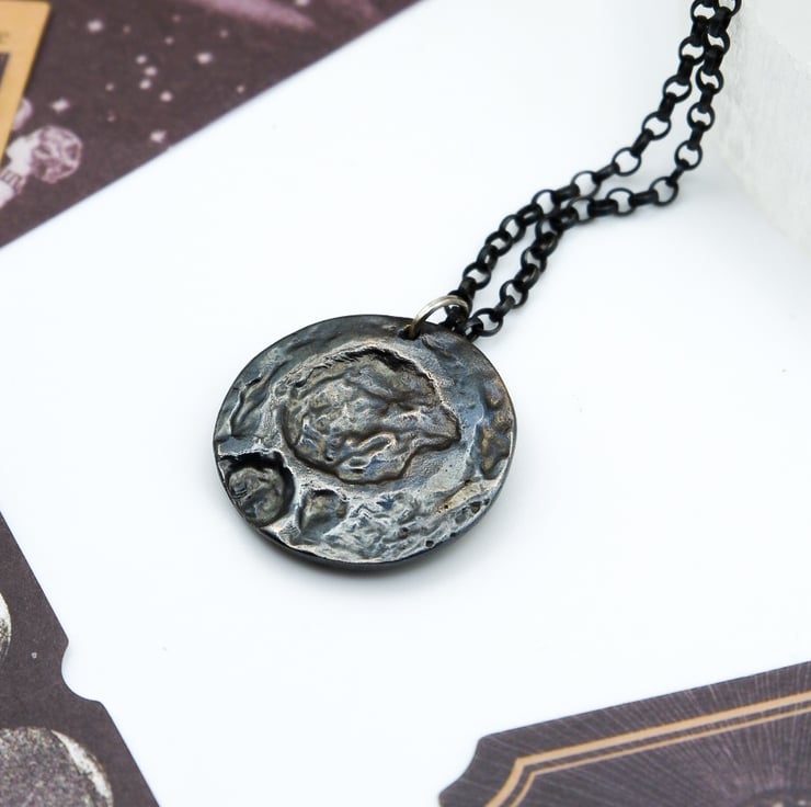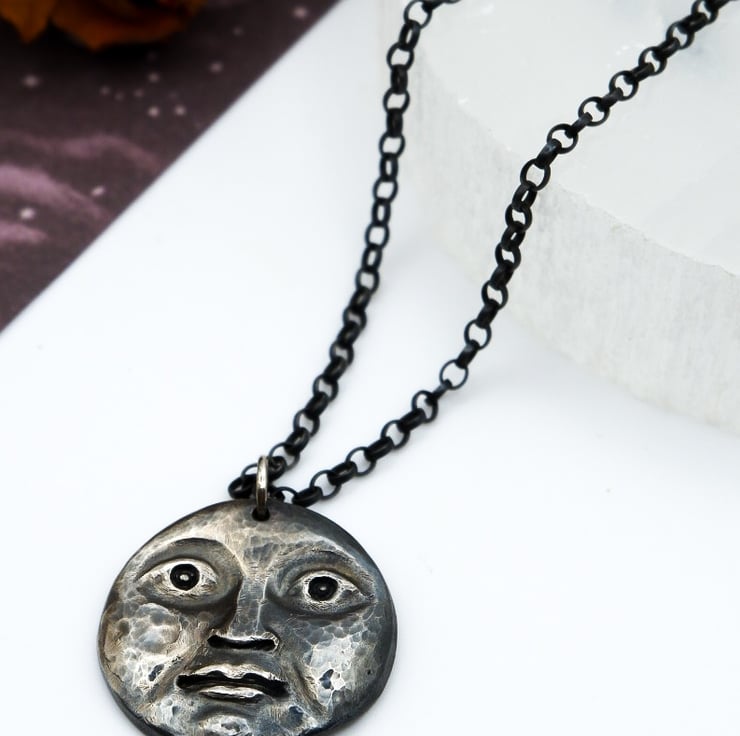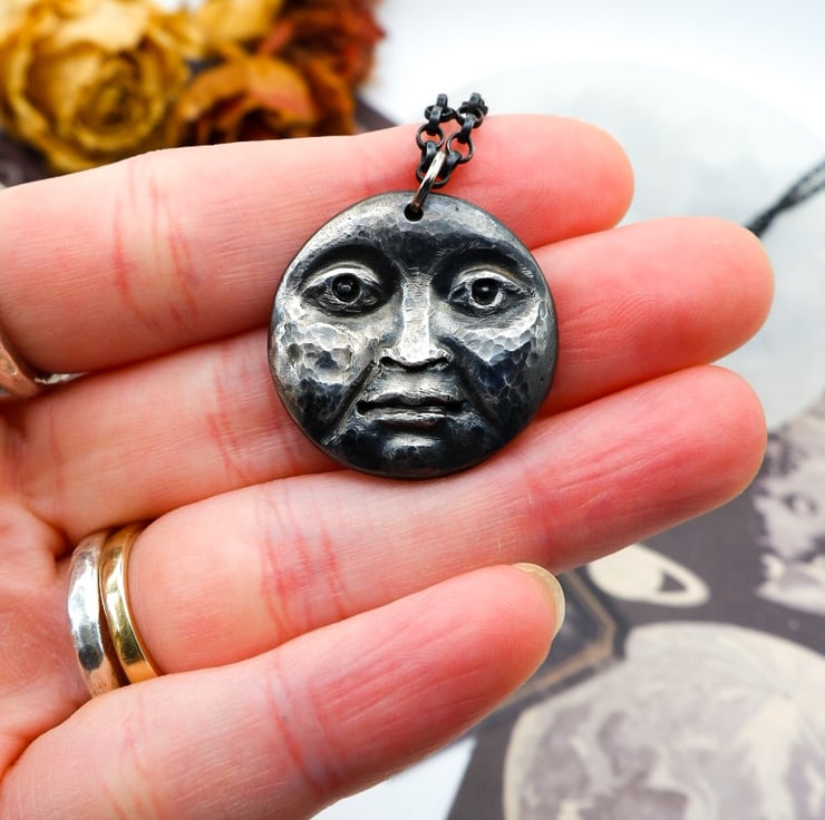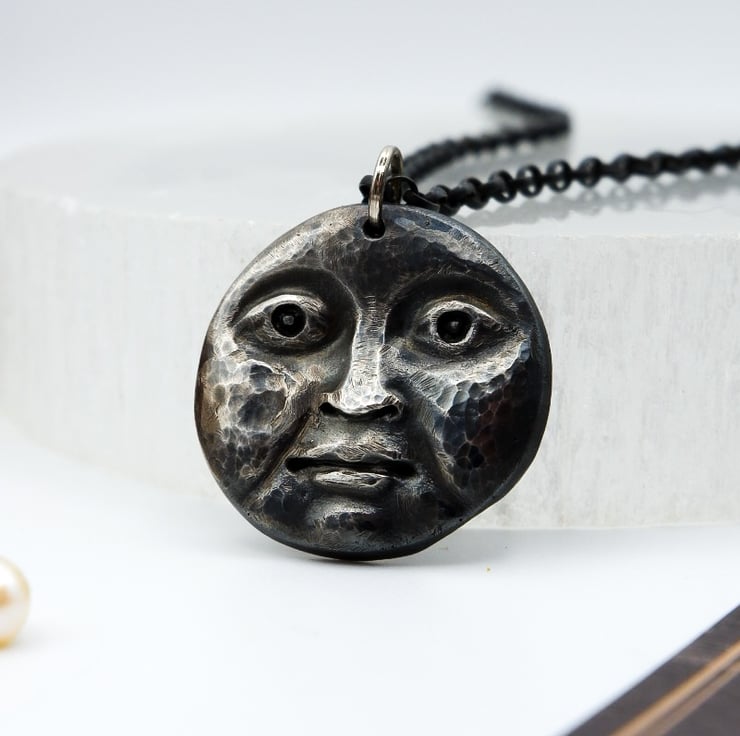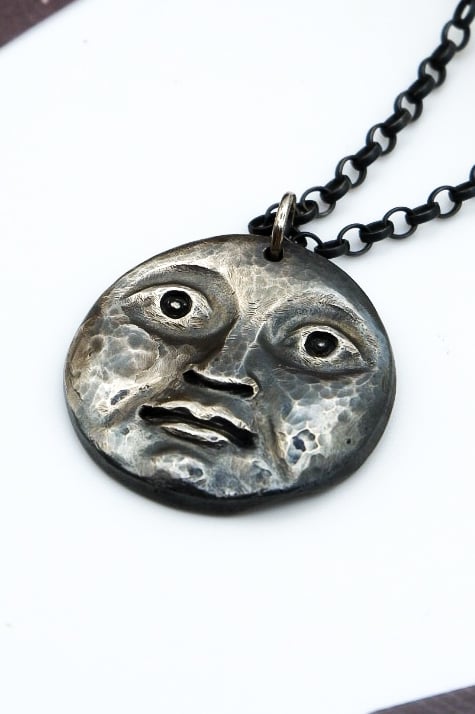 This is Patrice! I handcrafted this Moon face necklace using solid recycled fine silver, giving it a dreamy, magical vibe. The back even has the texture of the Moon’s surface!
