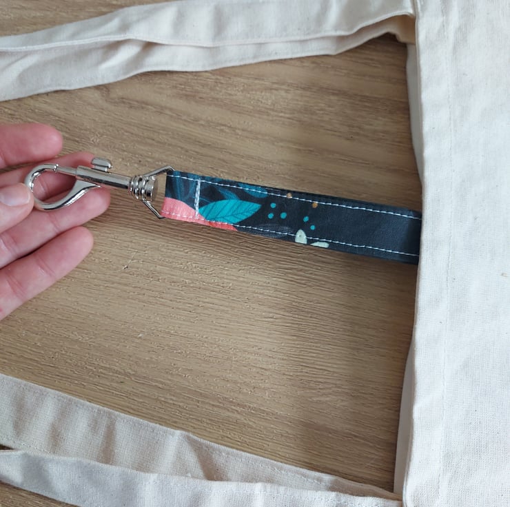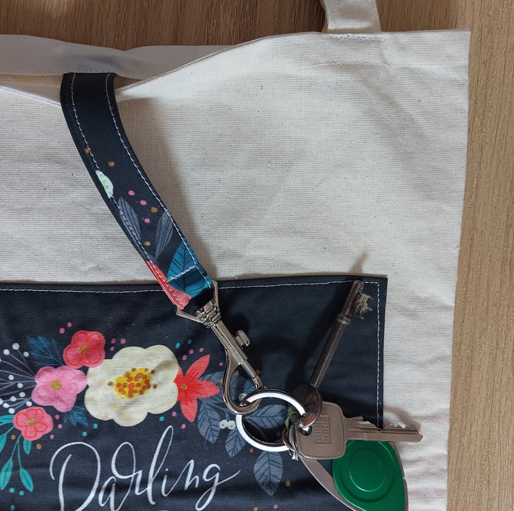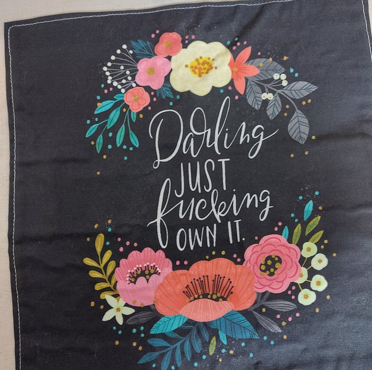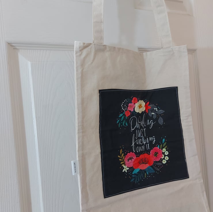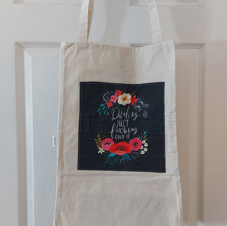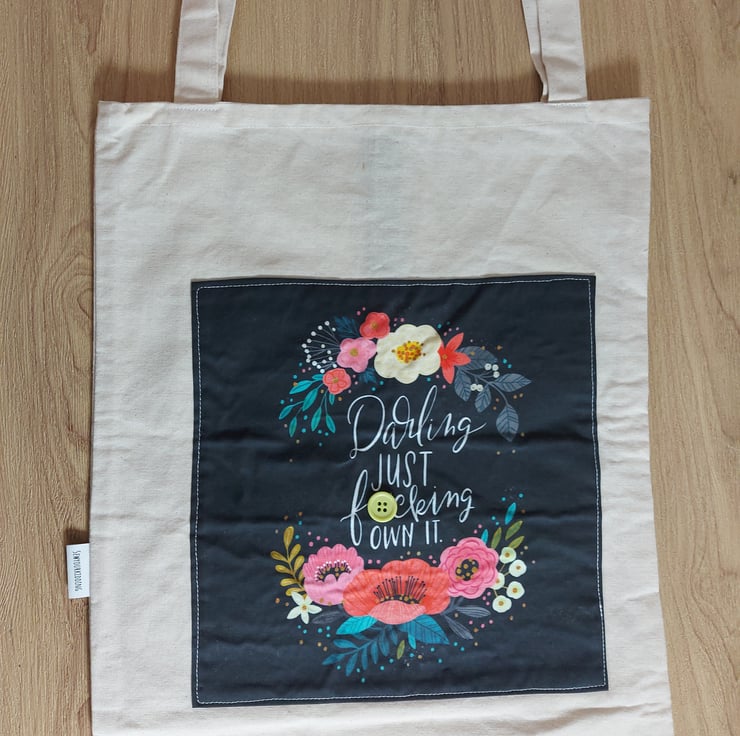 This is a one of a kind calico tote bag with a lovely motivational quote front and centre reading '' darling just f-cking own it " srounded by beautifull wild flowers these totes make brilliant gifts for your friends and family that like a little sass with their sustainable shopping , inside is a coordinating key clip so we can avoid those moments when we are rooting around the bottom of our bags hunting for them .