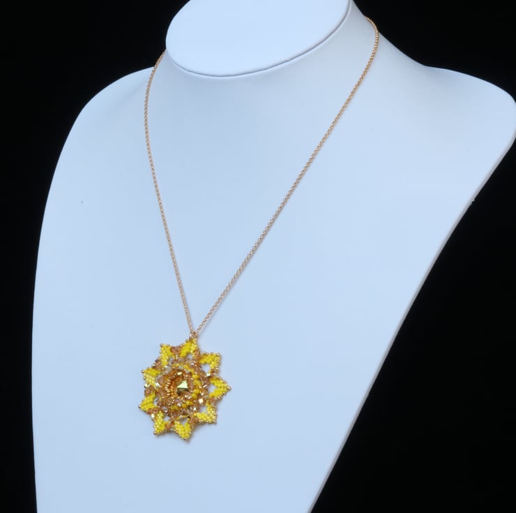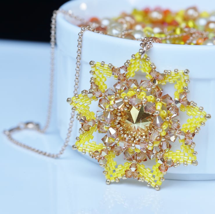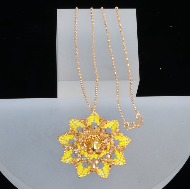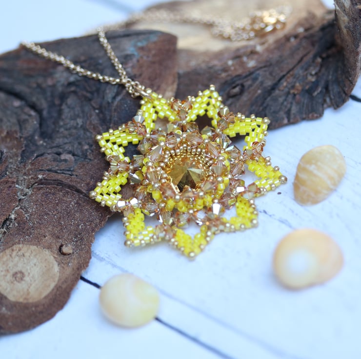 This delicate looking, sparkly nine-pointed star shaped pendant is made from no fewer than 54 Swarovski crystal bicones stitched around a crystal rivoli stone. Tiny yellow seed (Delica) beads complete the piece.