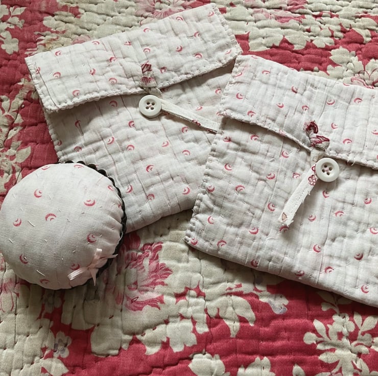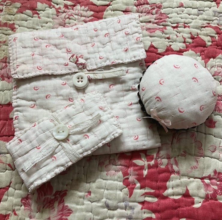 This pin cushion is made from a gorgeous vintage quilt, trimmed with a narrow silk ribbon bow.