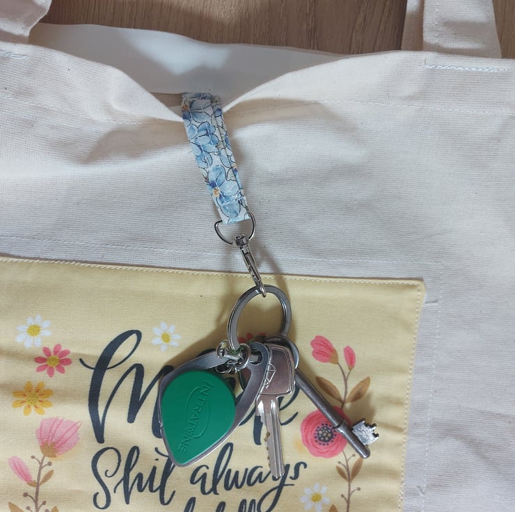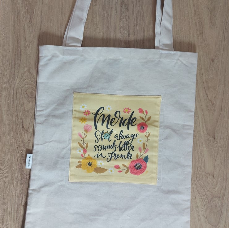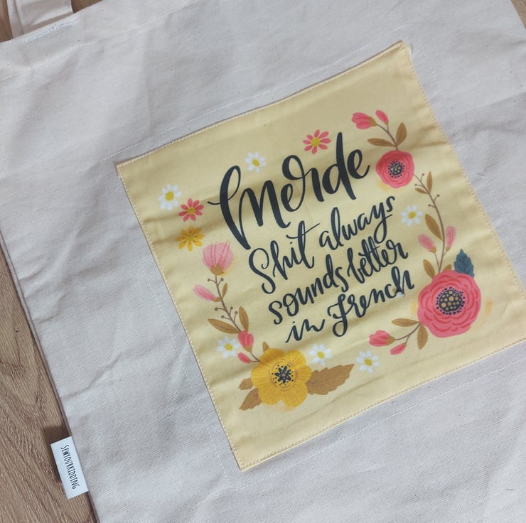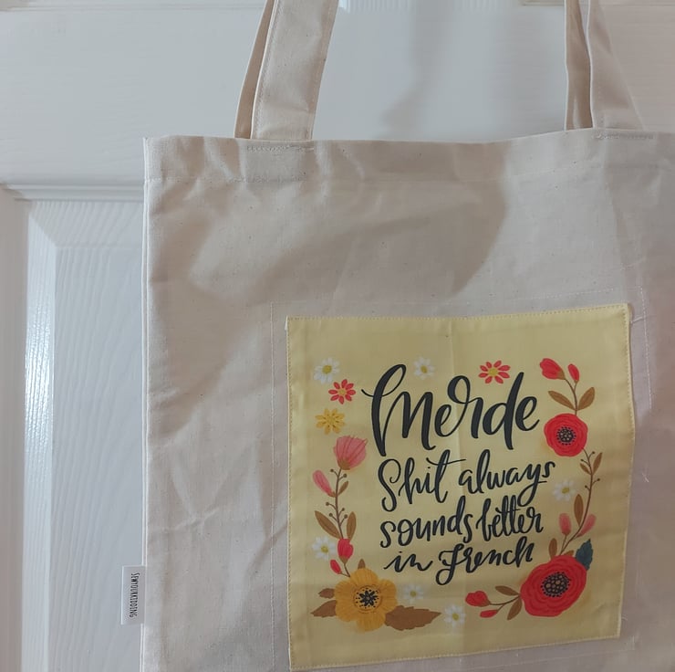 This is a one of a kind calico tote bag with a lovely motivational quote front and centre reading '' merde sh-t always sounds better in french '' surrounded by wild flowers these totes make brilliant gifts for your friends and family that like a little sass with their sustainable shopping , inside is a blue and yellow voilets key clip so we can avoid those moments when we are rooting around the bottom of our bags hunting for them .