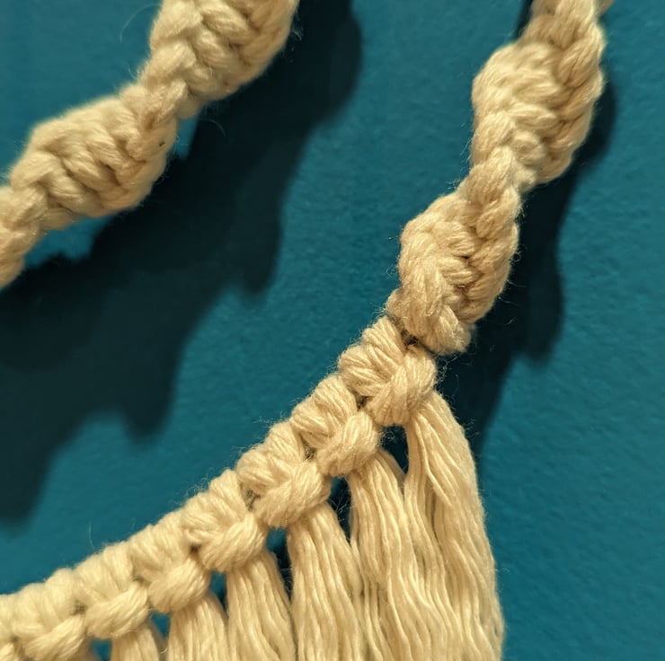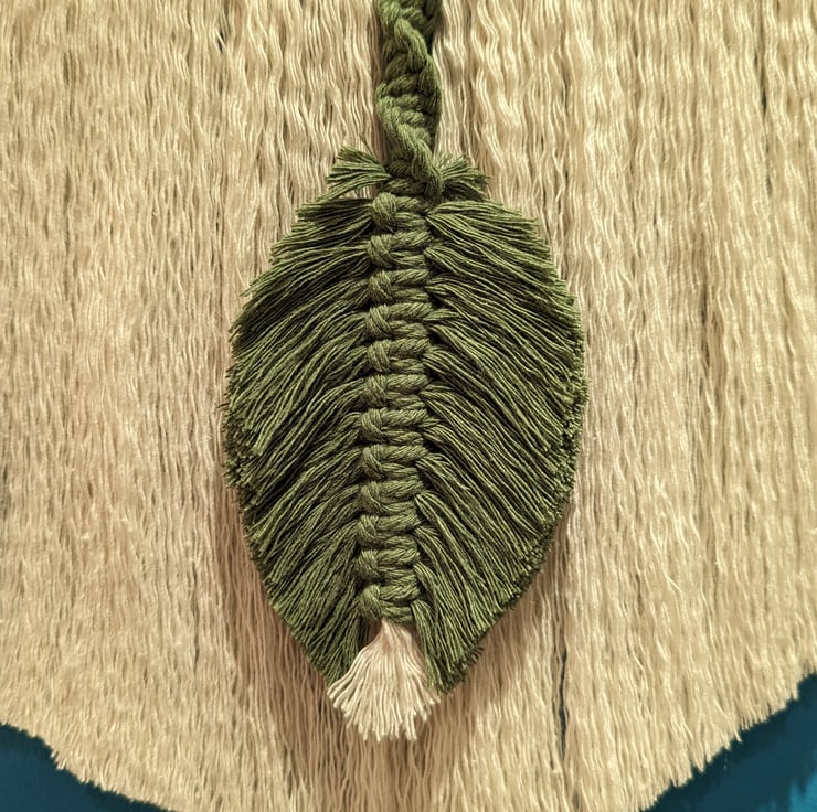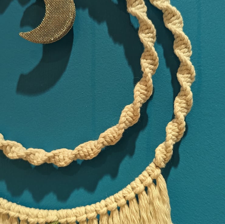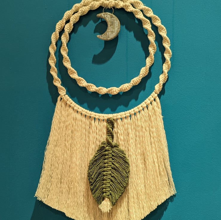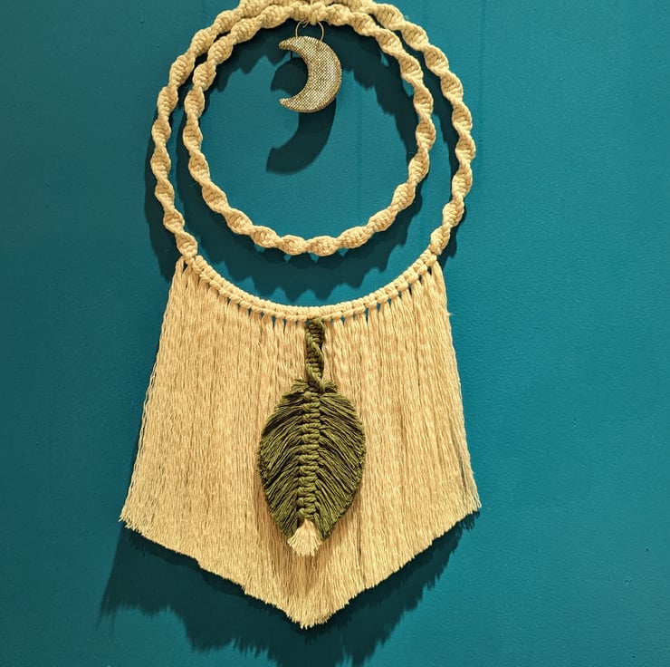 A simple but decorative wall hanging made with natural cotton cord in a pretty circular arrangement. The hanging also features a macrame leave and silver moon. This is perfect as a gift for someone or even to yourself to add bohemian elegance and creative beauty to the home.