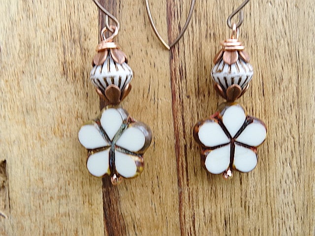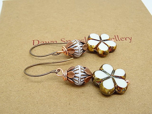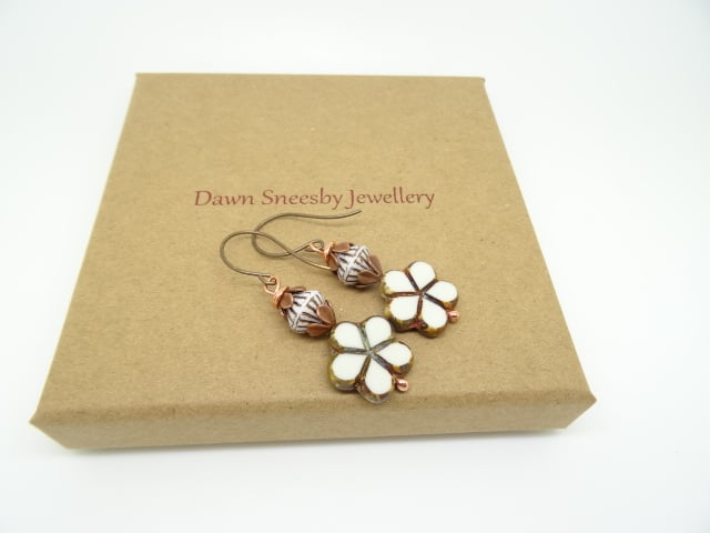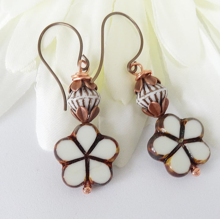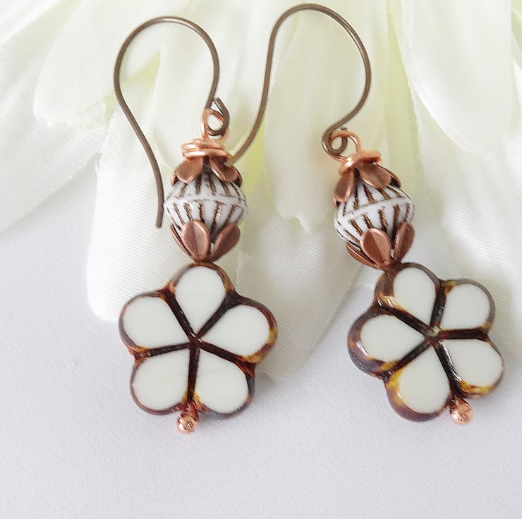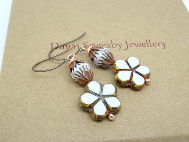 These earrings are just lovely. I have made them using 18mm Czech glass pansy beads in winter white with a antique finished edge. To these I have wired 10mm Czech glass antique finish Bicone beads also in winter white with a brown ribbed finish. I have topped and tailed the ribbed bicones with antique copper coloured bead caps. The earrings measure 2 inches (5cm) from top of vintaj brass, round loop, nickel free ear wires.