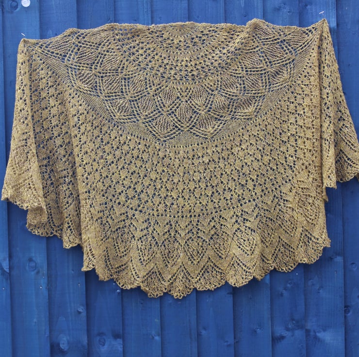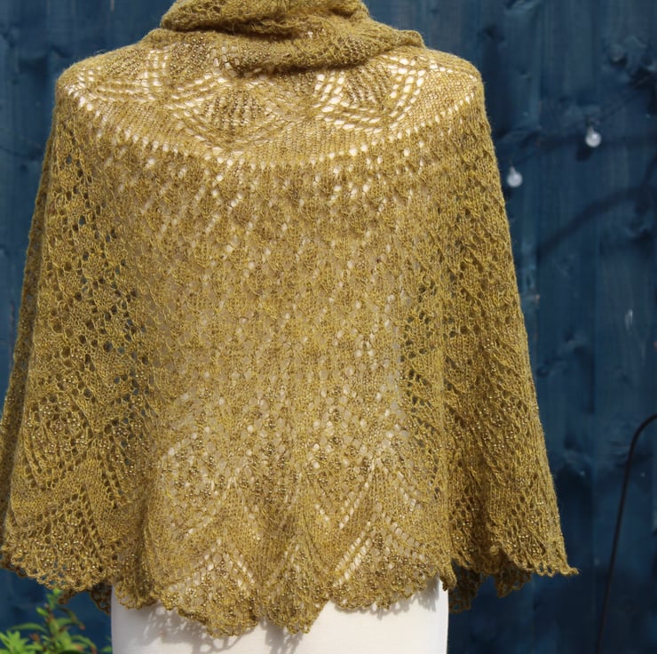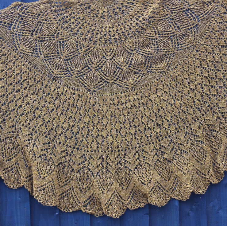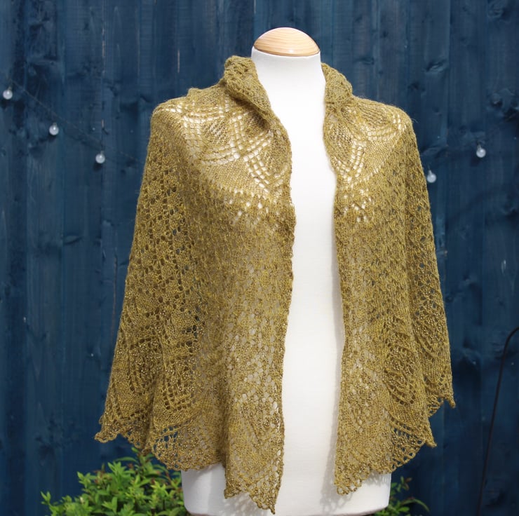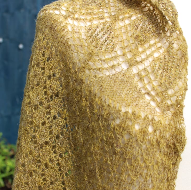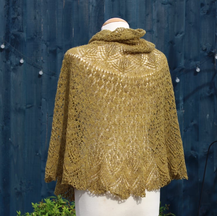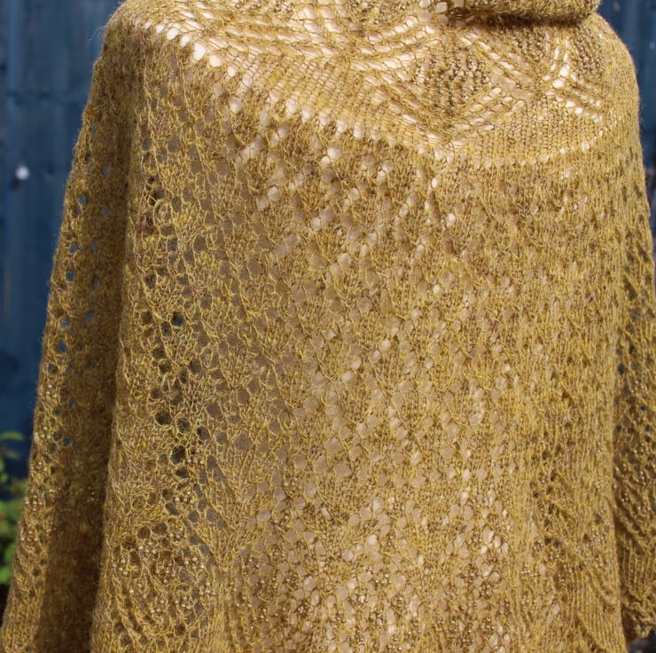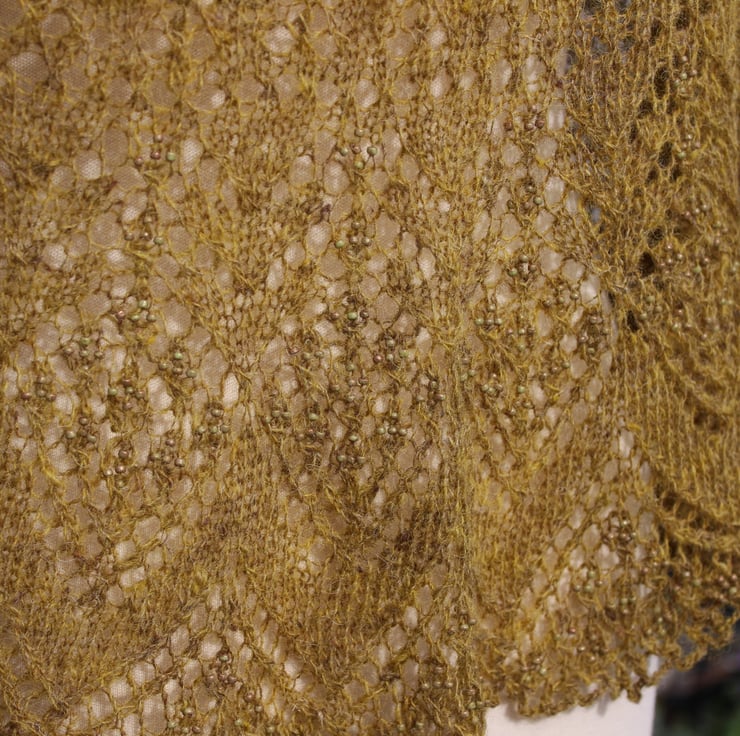 If you wish to see more photographs and read about how this shawl was made please visit my blog post about it. http://drapedinlacebyjuliablakeman.blogspot.co.uk/2011/03/beaded-moss-green-shawl-design-lf106.html