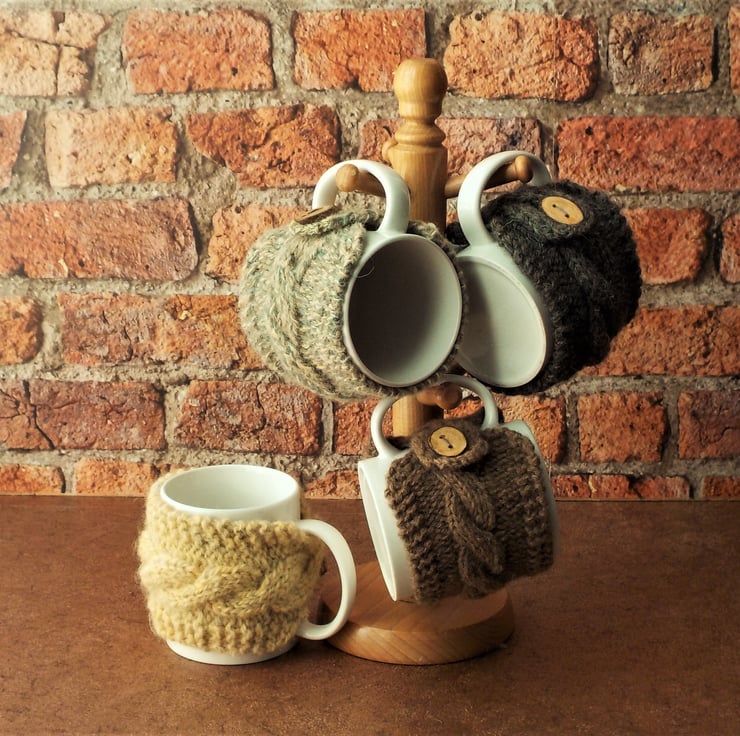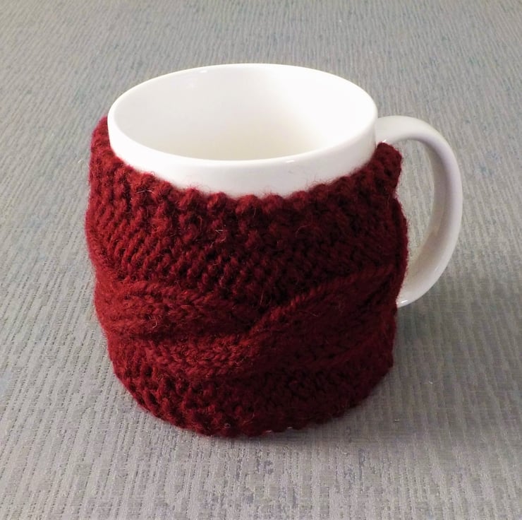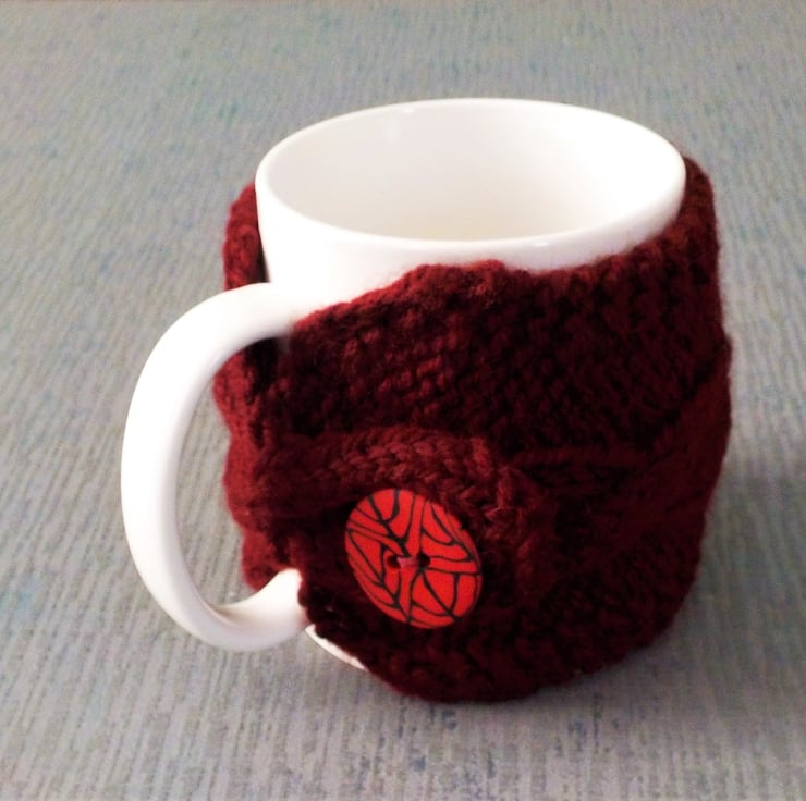 This lovely mug cosy is totally handmade in the UK. The gorgeous pure British wool is a deep wine red. I have used it to hand-knit a cable design mug cosy using needles, not a machine. For the perfect finishing touch, the cosy fastens through the handle of your mug with a handmade patterned button made by another British crafter.