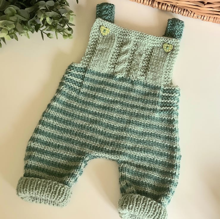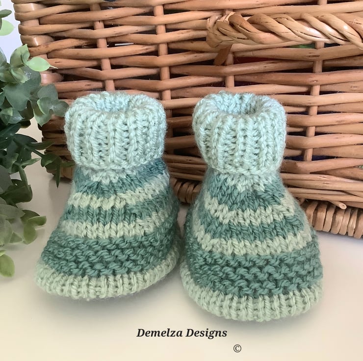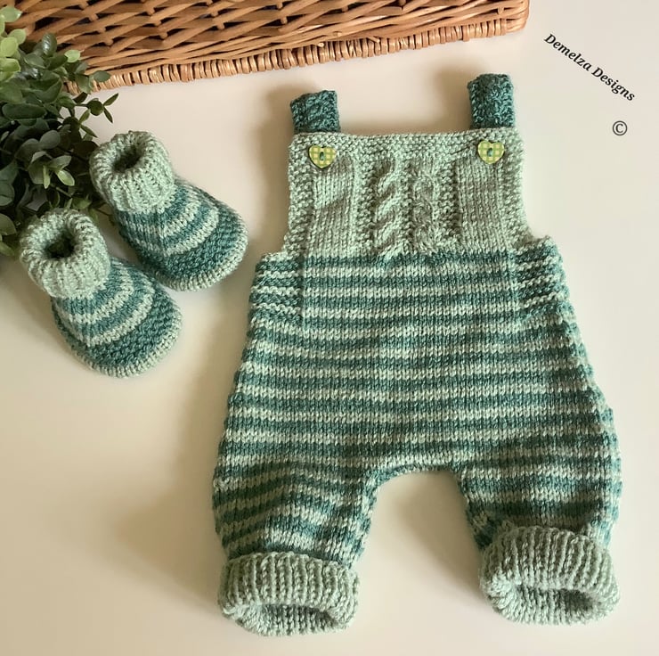 A cosy baby boys stripey rompers and booties set designed by Demelza Designs. The set has been hand knitted to exceptionally high standards using premium soft machine washable acrylic yarns. The buttons are made from genuine wood in a heart shape.