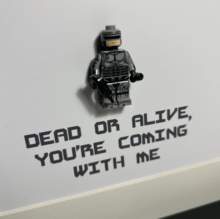 This fantastic custom printed minifigure depicts one who strikes fear into the hearts of any criminal… ROBOCOP. I remember watching this when I was younger and I still find it hard to watch. However, this little guy really captures how awesome he ended up being! We have mounted him into a deep box frame and teamed him alongside one of his famous quotes.