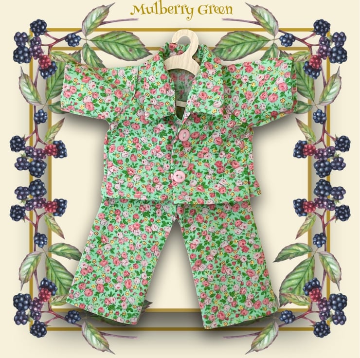 Cute little pyjamas in a rosebud print, to fit the Mulberry Green characters. The pyjamas are made from best quality cotton and fasten at the front with two little poppers underneath the buttons.