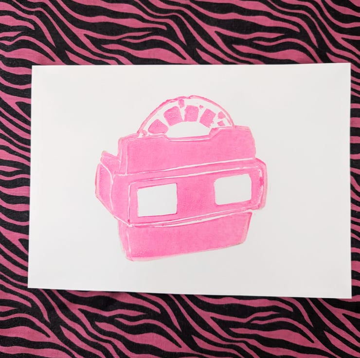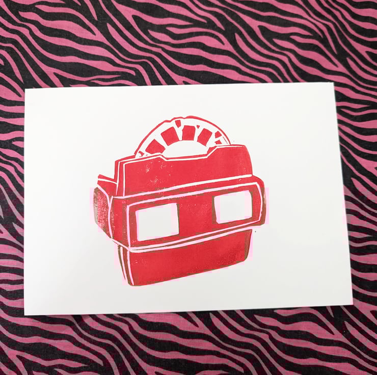We've created this Lino print, drawing inspiration from the iconic toy viewfinders of yesteryears. The details and vibrant colours are expertly crafted to transport you back to a time when imagination knew no bounds.