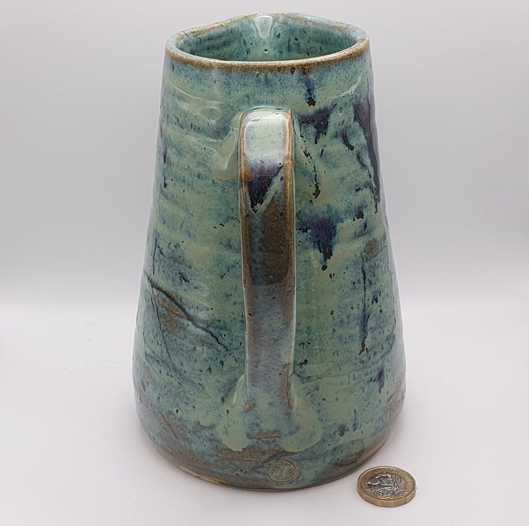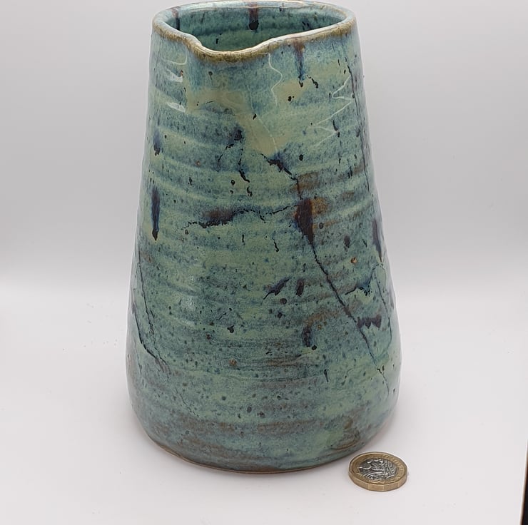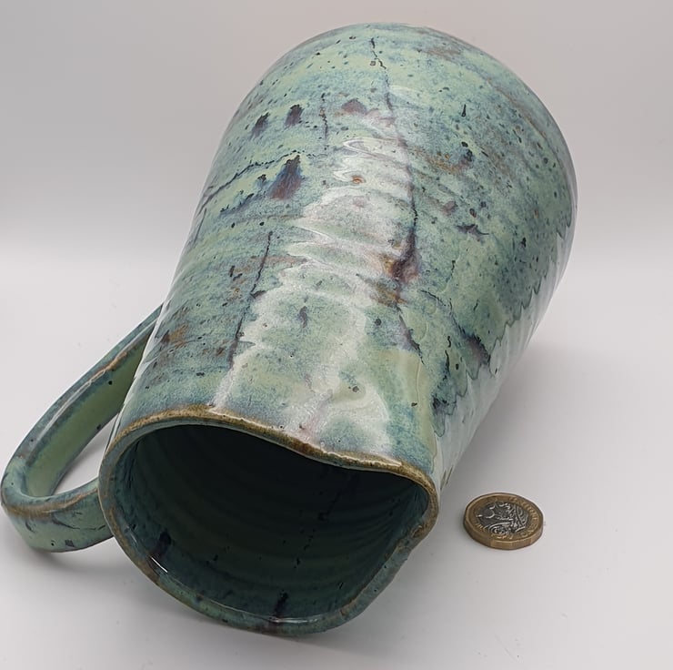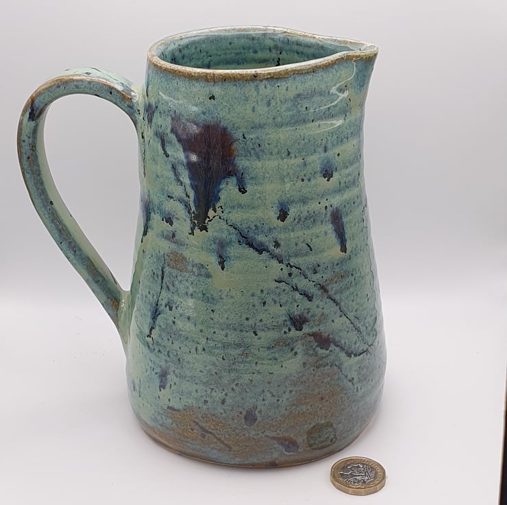 Glazed in turquoise with satters of Root Beer (brown glossy hlaze)
