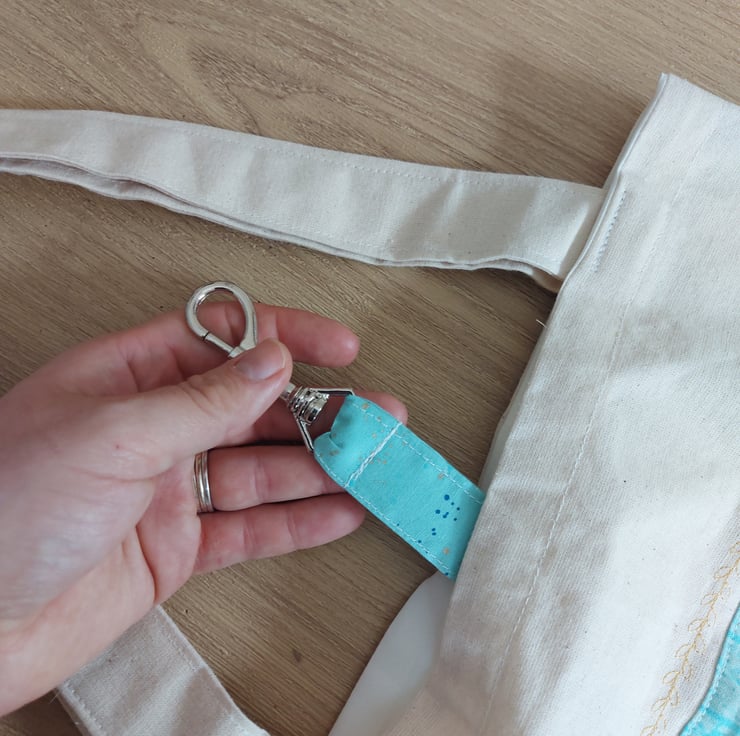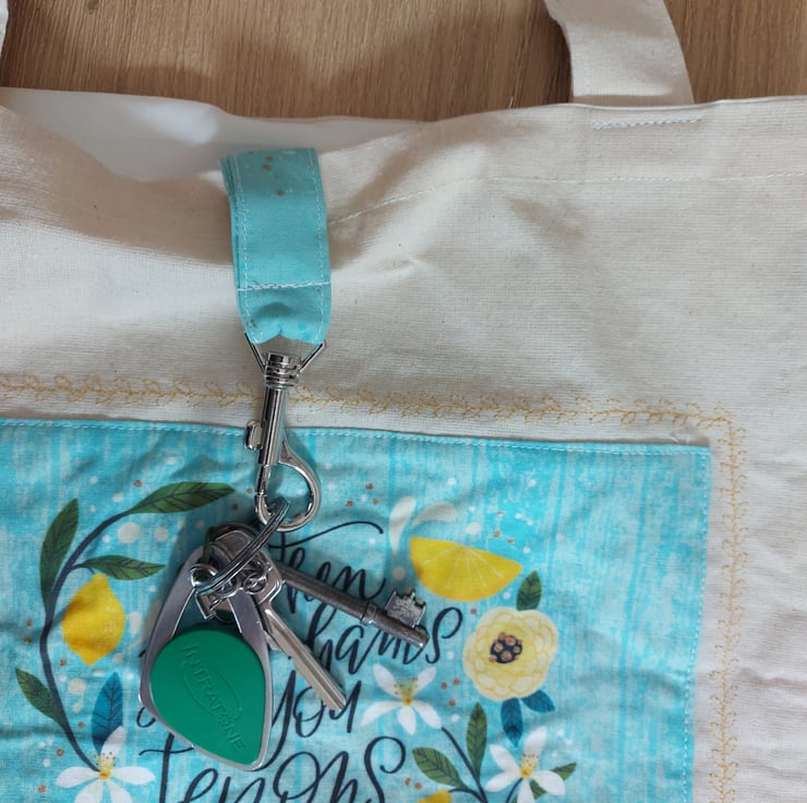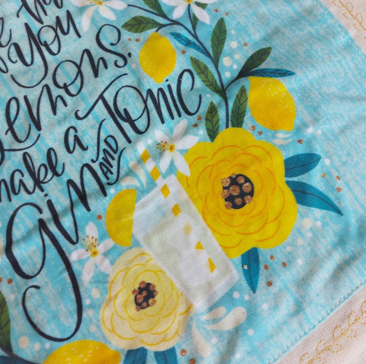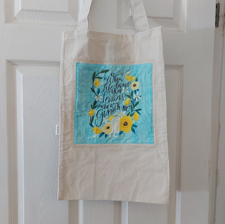 This is a one of a kind calico tote bag with a lovely motivational quote front and centre reading '' when life gives you lemons make gin and tonic " srounded by beautifull flowers lemons and lemon blossoms these totes make brilliant gifts for your friends and family that like a little sass with their sustainable shopping , inside is a coordinating blue specalled key clip so we can avoid those moments when we are rooting around the bottom of our bags hunting for them .