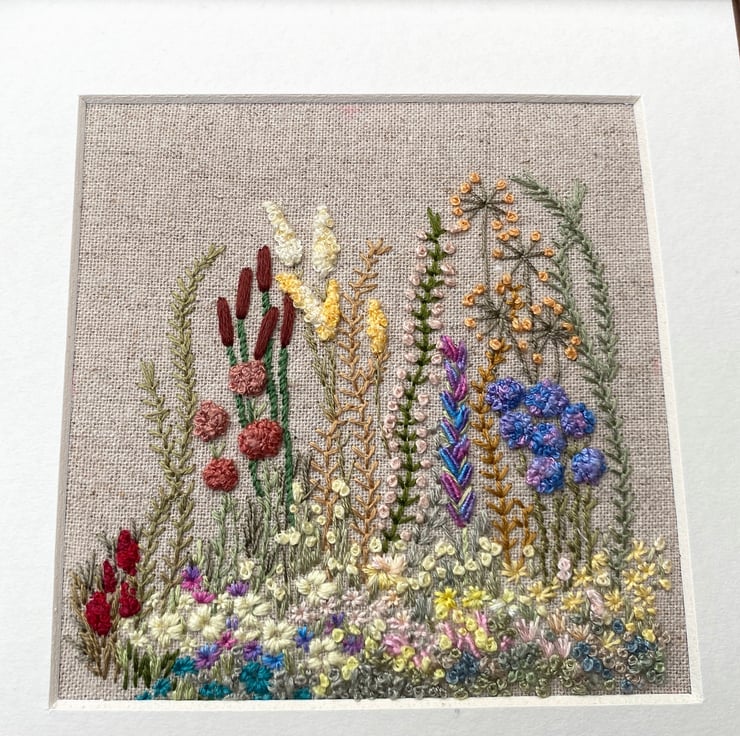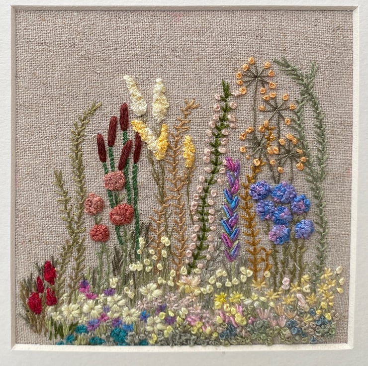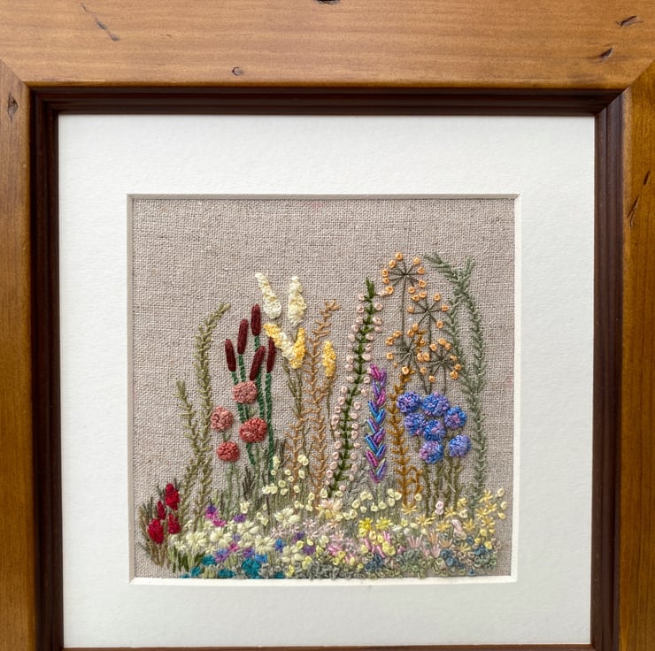 My passion is hand embroidery and this is my favourite style, a picture crammed with stems and flowers in colours I think work together but are not necessarily correct but an artists impression.