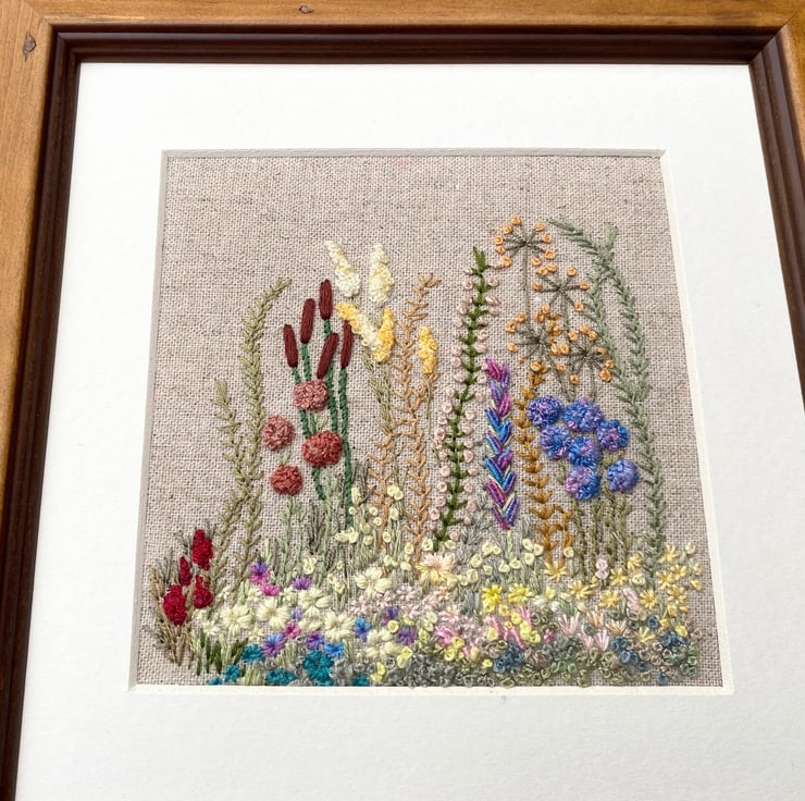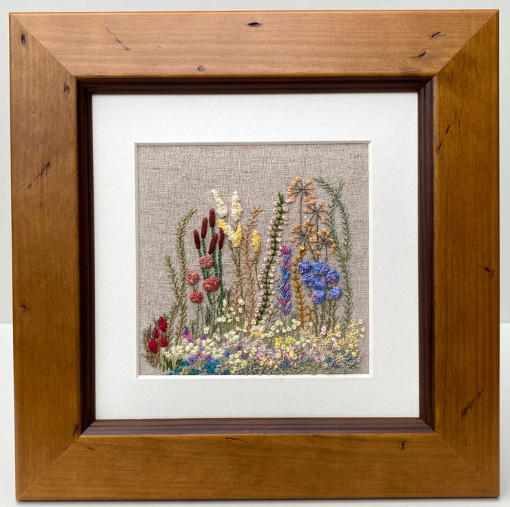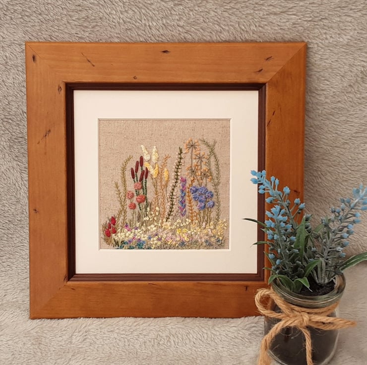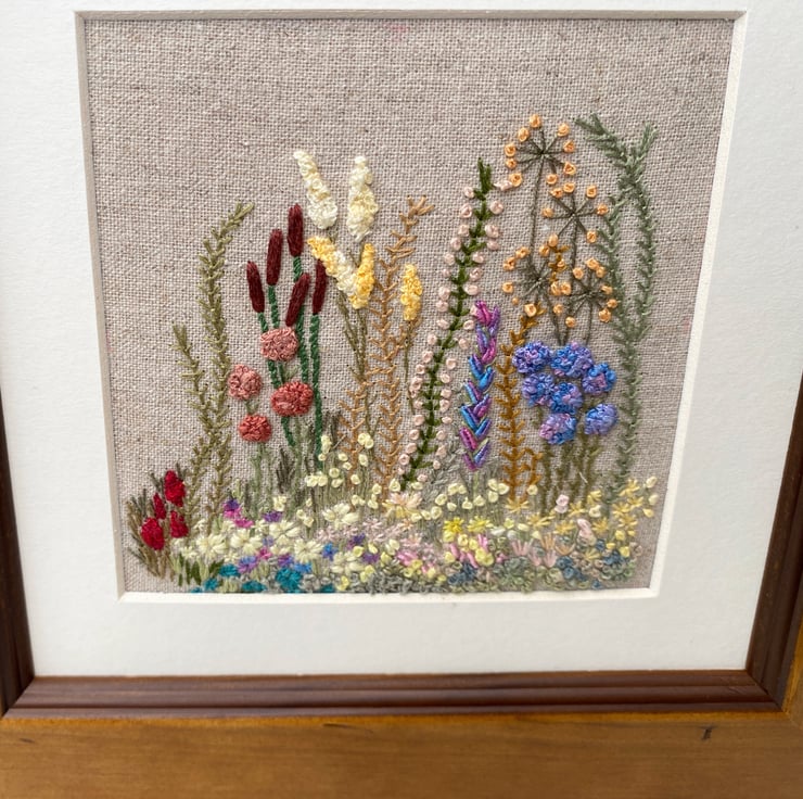 Beautifully detailed picture which has been hand embroidered, a floral cottage garden border.