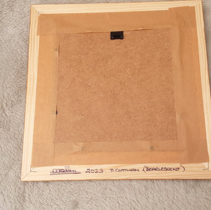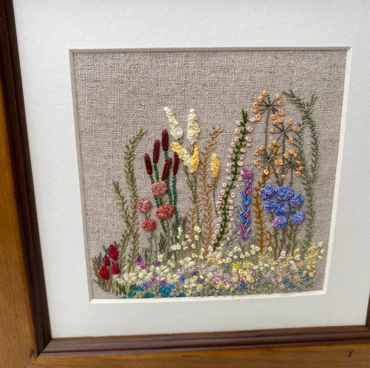 Beautifully framed by myself, stretched with lacing to the back and very lightly padded with wadding. The actual embroidery measures 4" x 4" and has been hand sewn onto linen, mount board measures 6" x 6" and complete picture just over 8" square.