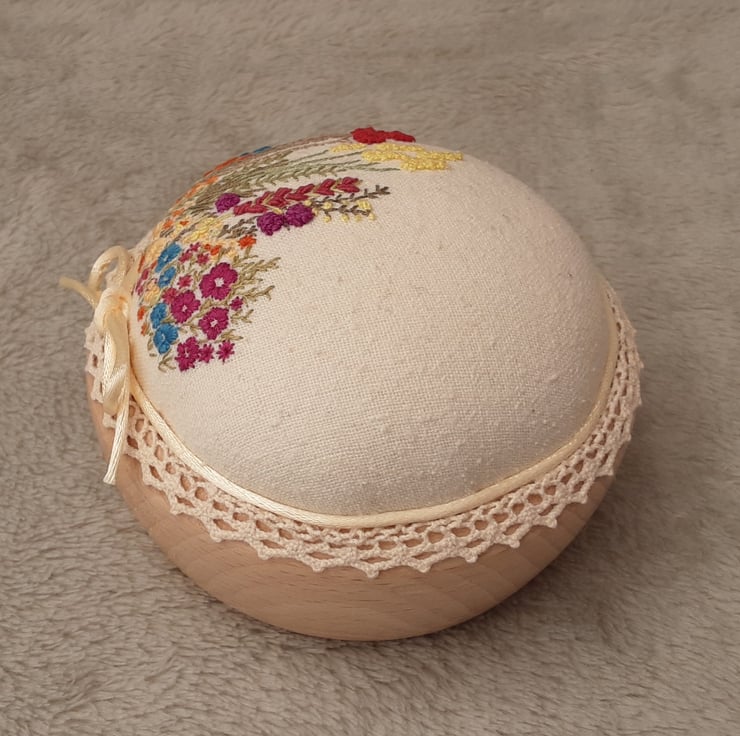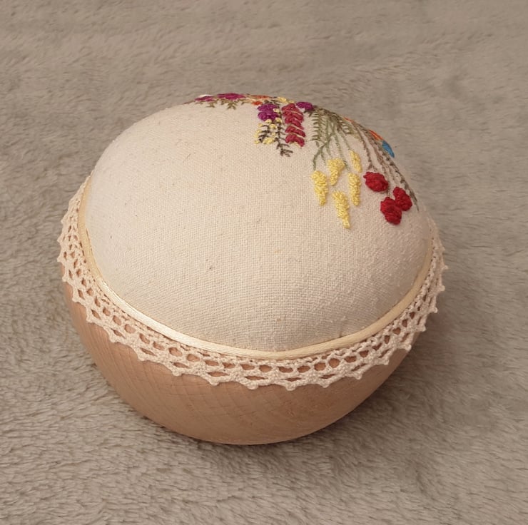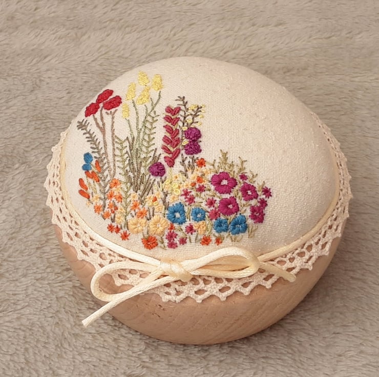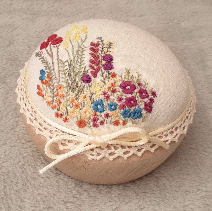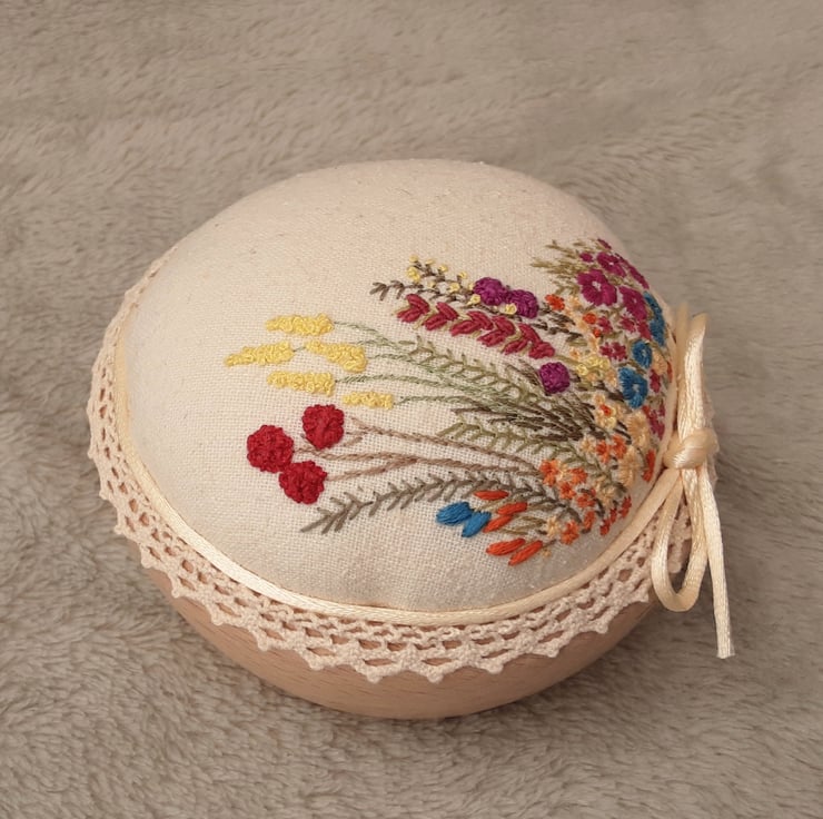 This pincushion measures 4" diameter, a good size for all of those needles and pins.this pincushion has been hand sewn in bright jewel colours, vibrant yellows, deep teal blues, reds, bright oranges and fuschia with soft lemons and greens. Various stitches have been used to create this interesting floral piece, a little bit of the English countryside. I sew using colours from my imagination, using my own interpretation rather than the colours we see in the natural world.