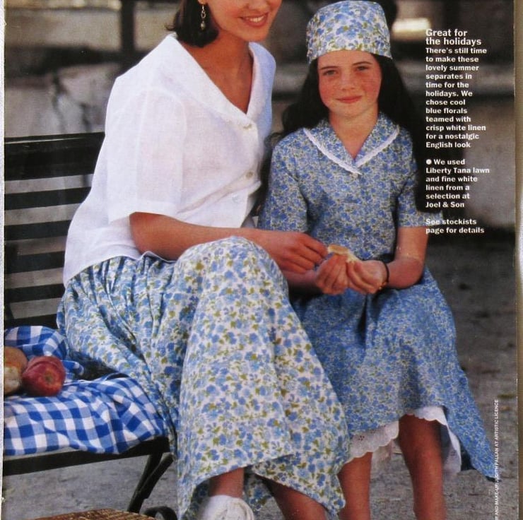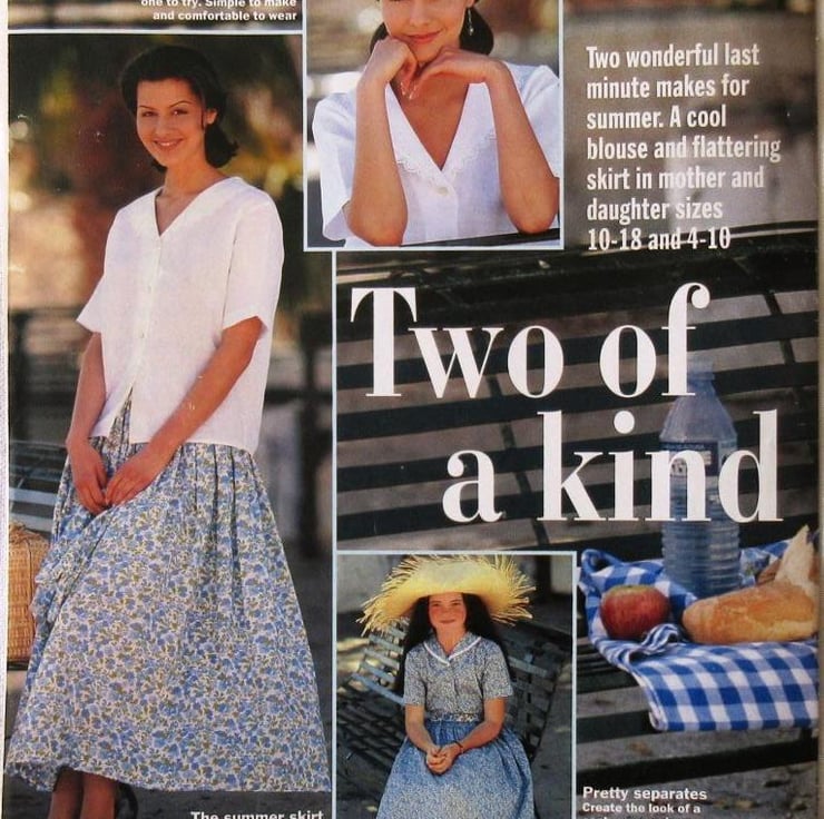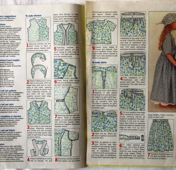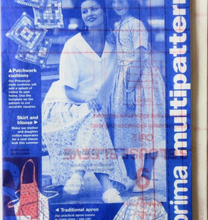 A multi-size sewing pattern for a mother and daughter blouse and skirt in sizes 10 - 18 (bust 32"/83 cm - 40"/102 cm) and girls' sizes 4 - 10 (chest 23"/58 cm - 28"/73 cm, a Prima pattern). The blouse has short sleeves, front button fastening and a shawl collar. The skirts are made from rectangles of fabric, so no pattern pieces are given for the skirts. A pattern for an apron for a man, woman and child is also given. There is also a chart for a knitting pattern, but I don't have any more details about this project. The pattern is dated August 1994.
