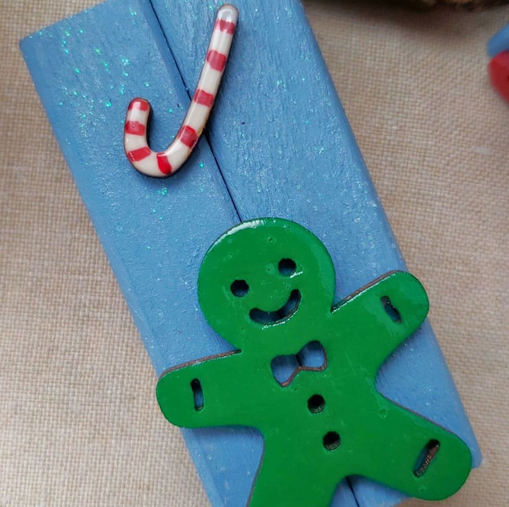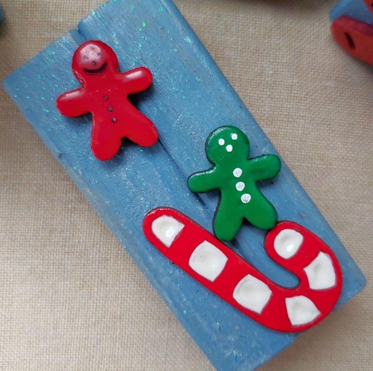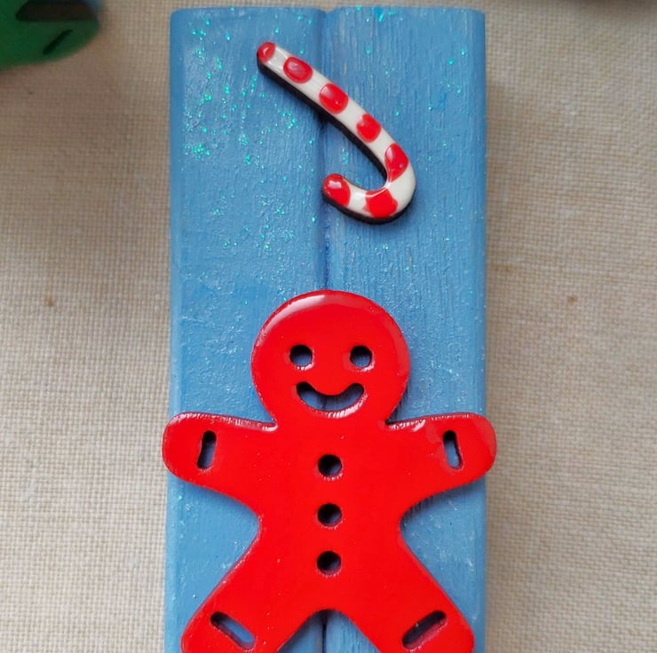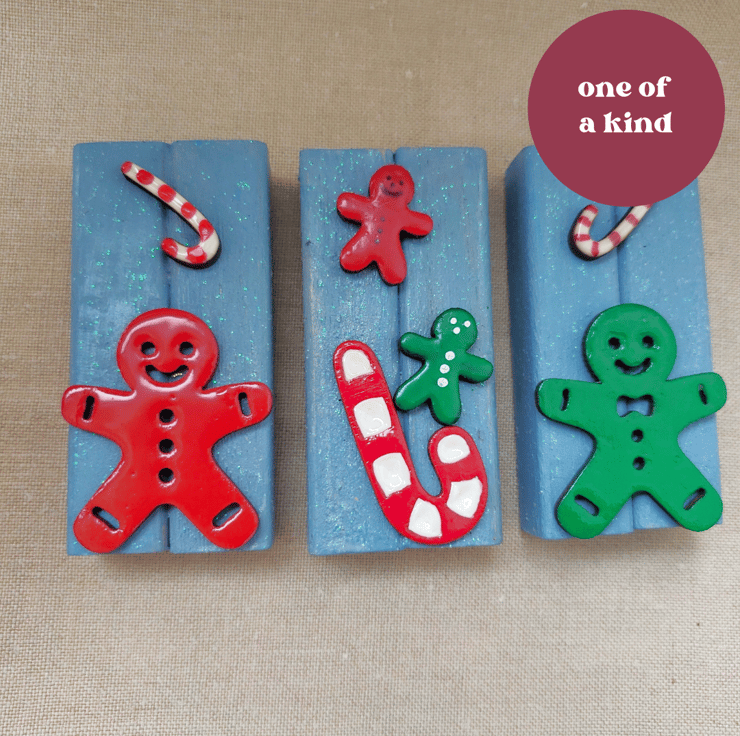 3 unique, hand painted wooden ornaments featuring gingerbread men and candy canes. If you like to be different to everyone else at Christmas then these are for you.