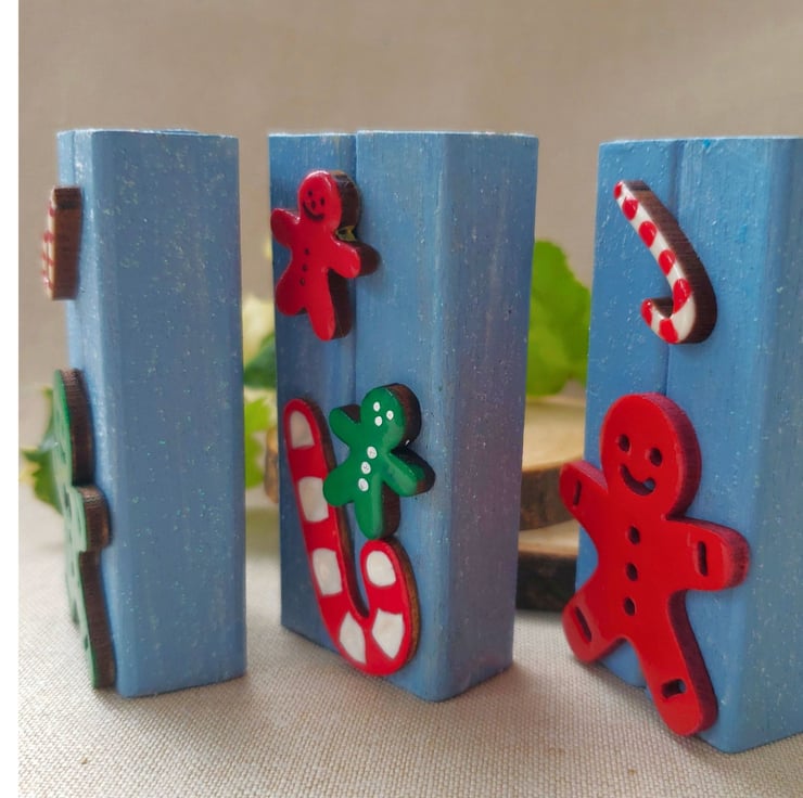 Made using old Jenga blocks, recycled wooden shapes and acrylics. I've created a pale blue chalky paint with added glitter medium to use as the background. Then hand painted the wooden shapes to create 3 individual but contrasting ornaments.