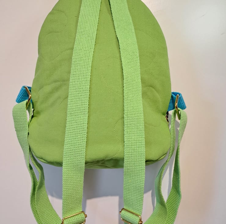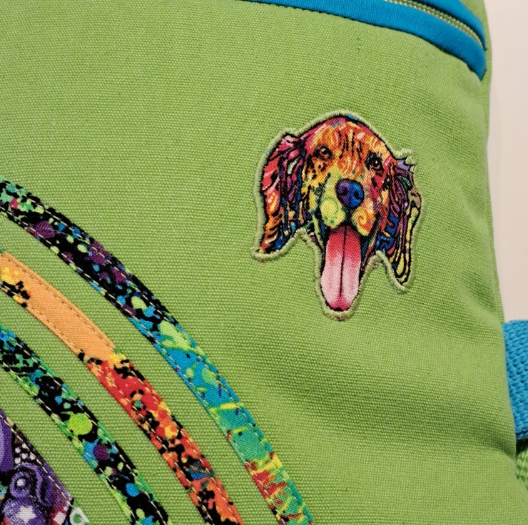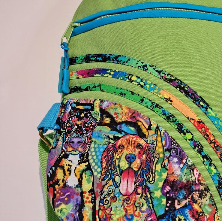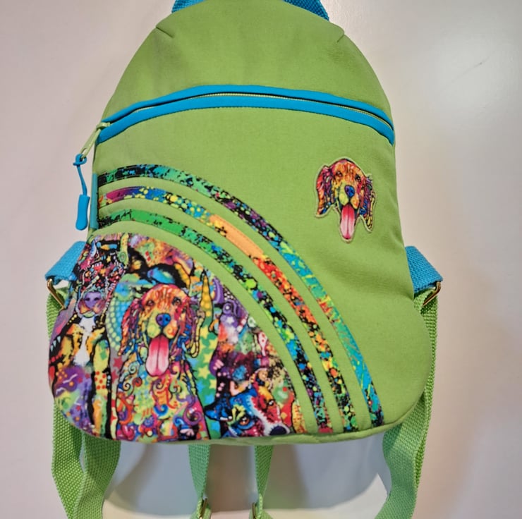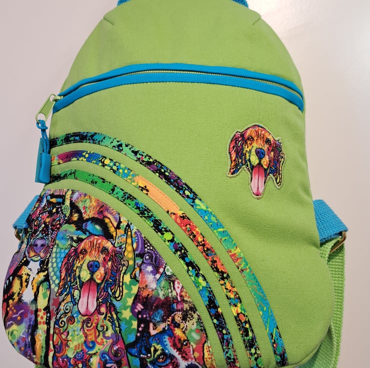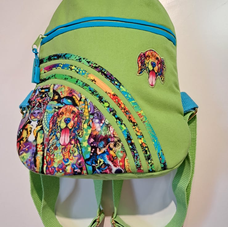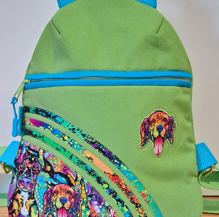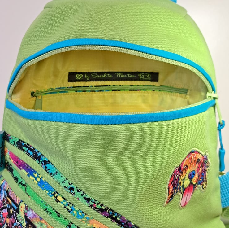 Small lime green patchwork and applique rucksack with colorful dog pattern. The lightweight handmade canvas backpack main color is lime green,the patterns are turquoise, yellow,pink, lilac orange and red colors with different kinds of dogs. The bag also decorated with applique dog face. The shoulder straps are adjustable, also has a top handle. The rucksack closing with zip on the front,has inside pocket with zip closure. The lining made from waterproof fabric. This is a small size rucksack, I recommend for ladies . The dimensions of the rucksack:hight 30cm,width 25cm, depth on the bottom 9cm.