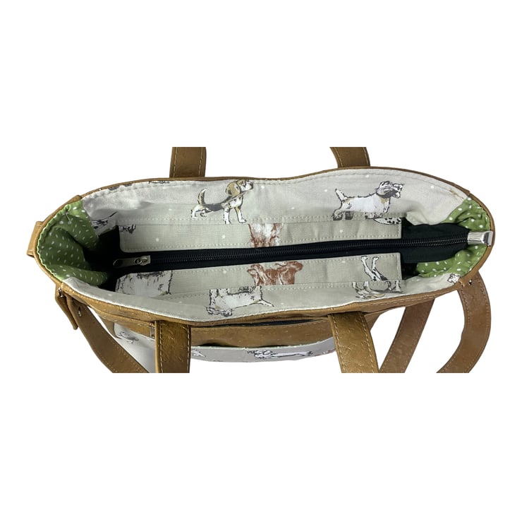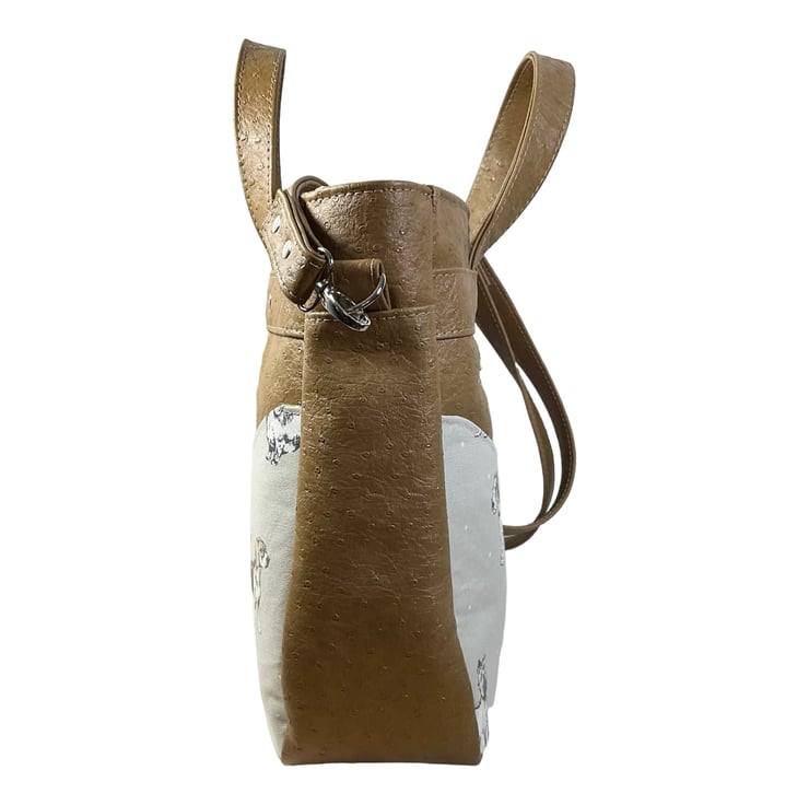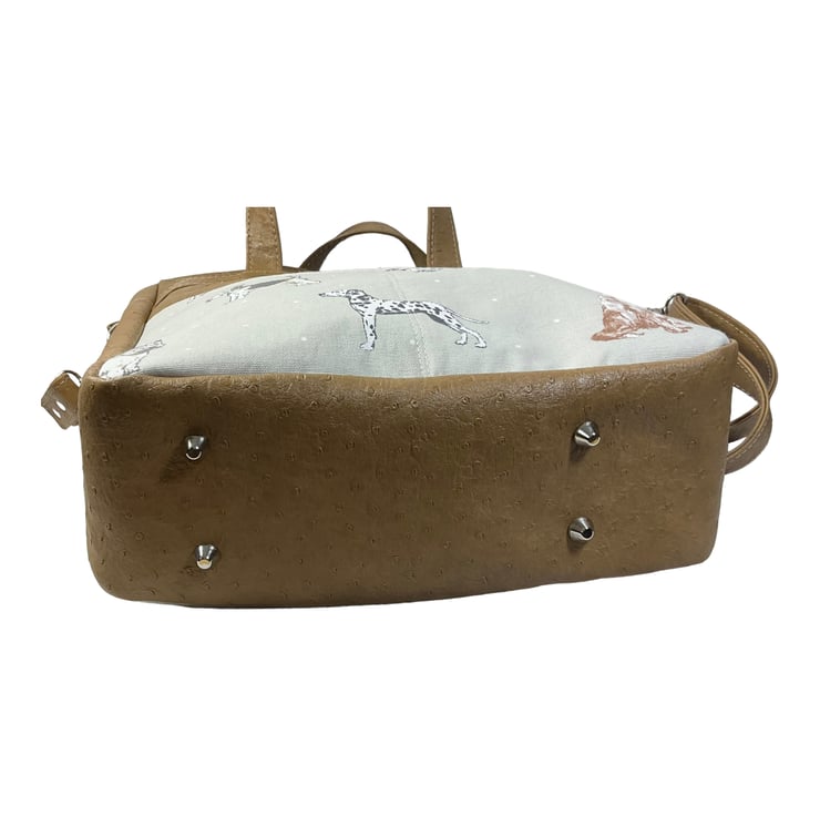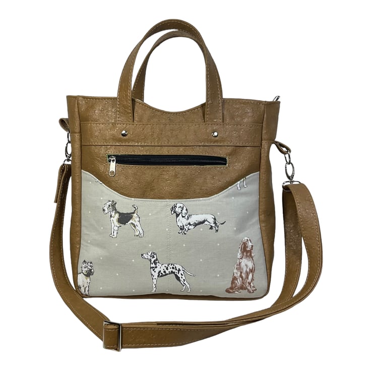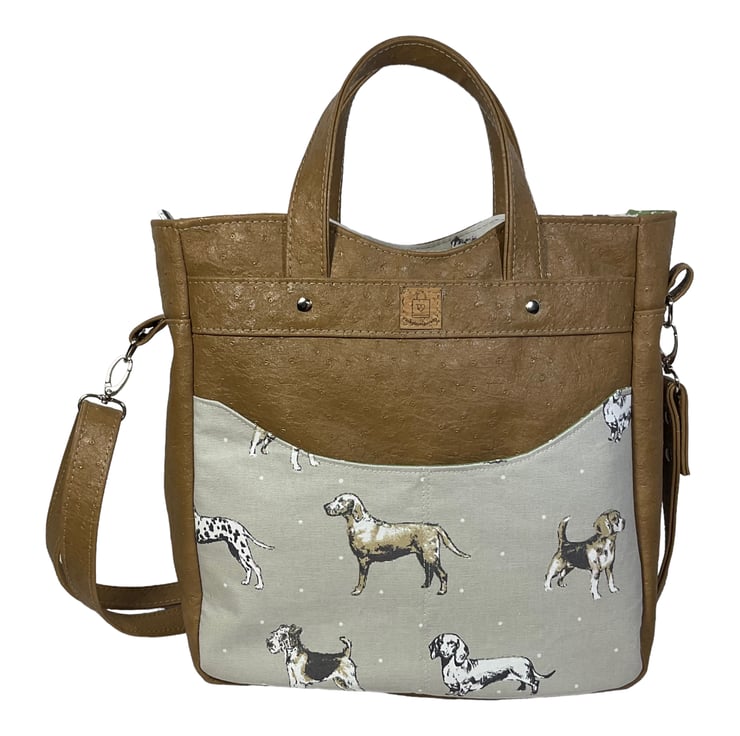 A medium to large sized handbag. Made in the cutest dog print cotton on a light coffee base for the feature slip pockets on the front and back, along with caramel faux ostrich skin leather accents.