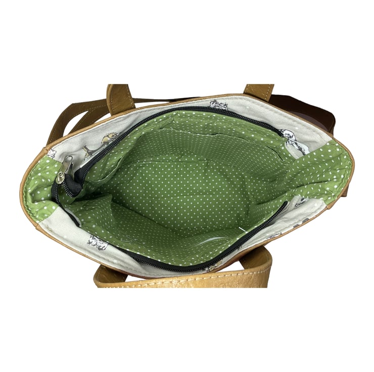 Inside, the bag is fully lined in sage green with white polka dots cotton, with a yellow zip and the entire bag is interfaced and has a foam layer for form.