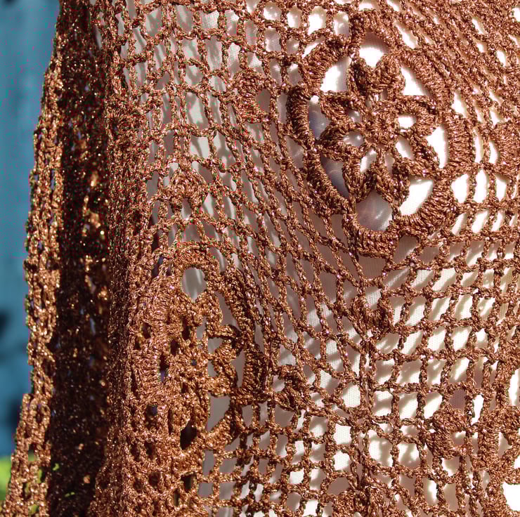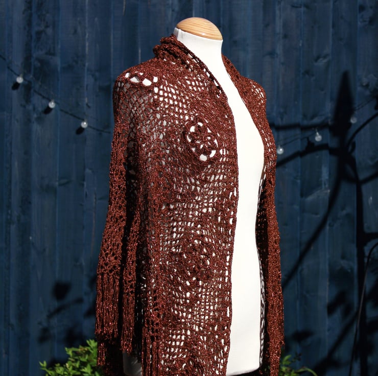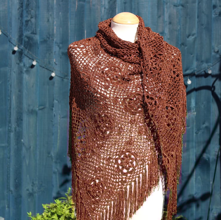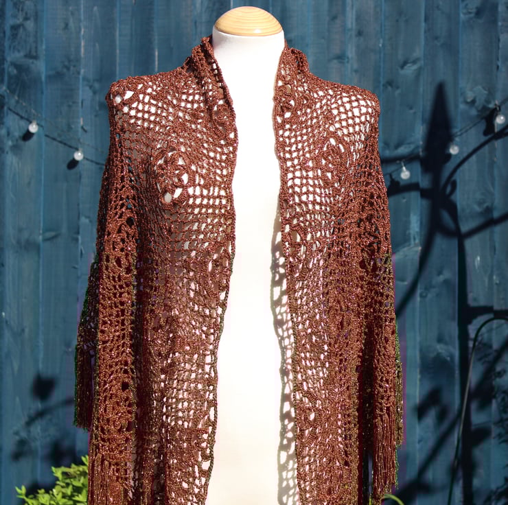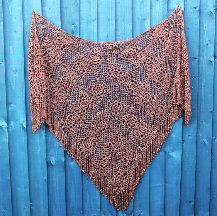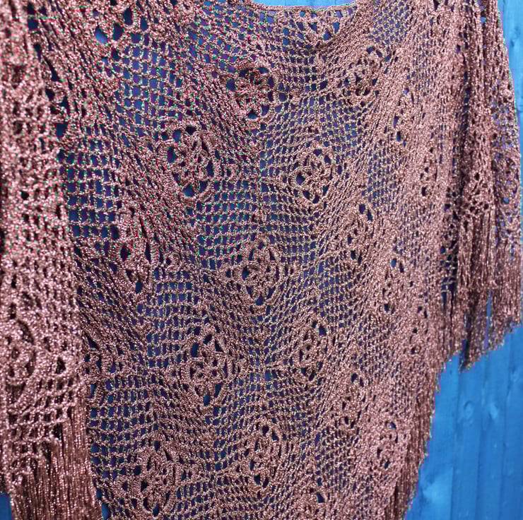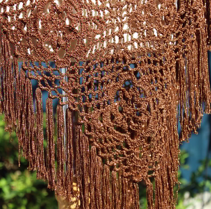 This crocheted fringed triangular shawl is made using genuine vintage Twilley's Goldfingering thread in bronze, using one of their patterns published in 1978. The use of these vintage materials not only adds a unique charm to the shawl but also ensures its quality and durability. Designed during the disco era and crafted in recent years — very retro, very sparkly, very swishy fringing. When the sun hits this shawl, it creates a mesmerising display of sparkles!