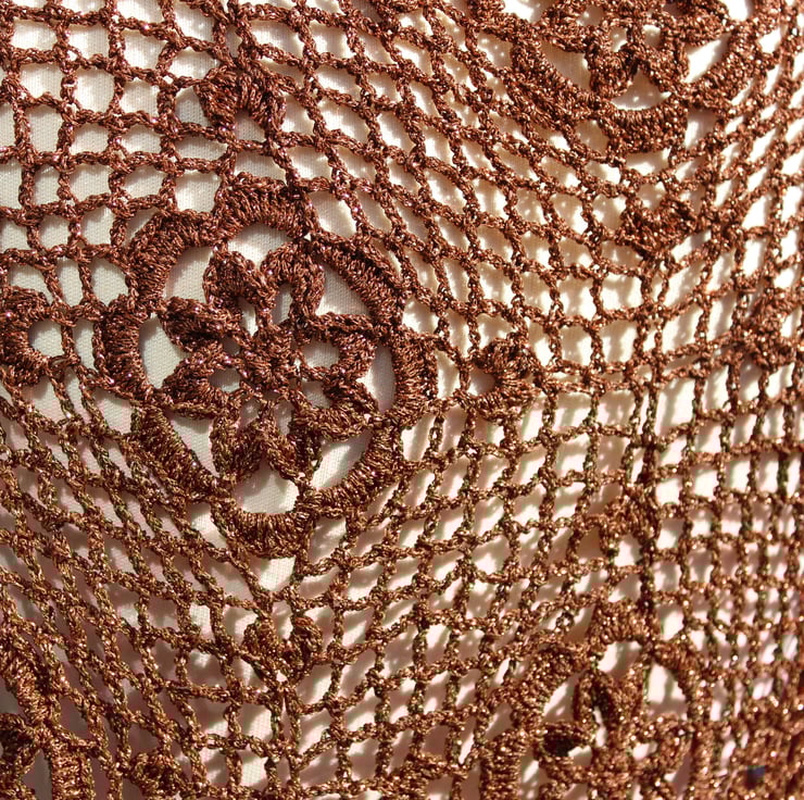 Large triangular crochet shawl in sparkly bronze vintage thread - design LF427
