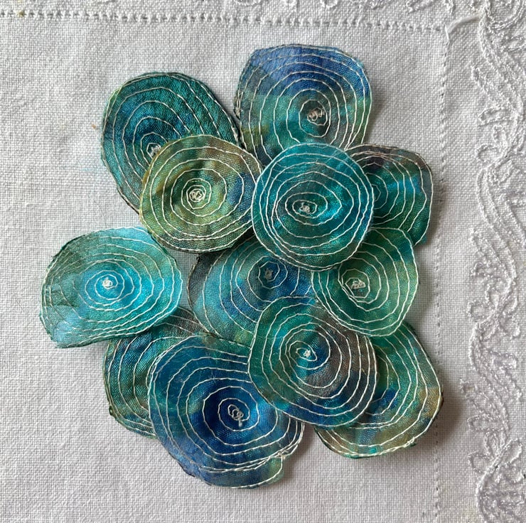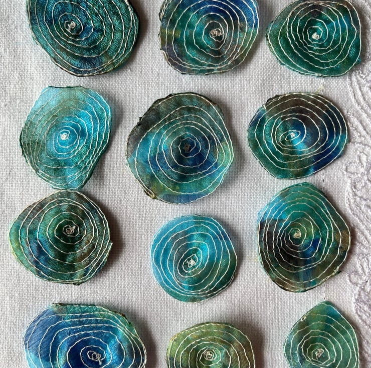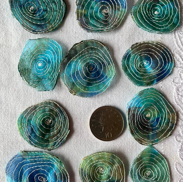 This pack of 12 embellishments have been made by using free motion embroidery techniques - drawing with the sewing machine. Each one is slightly different from another, giving them a quirky and organic look.