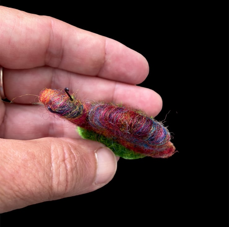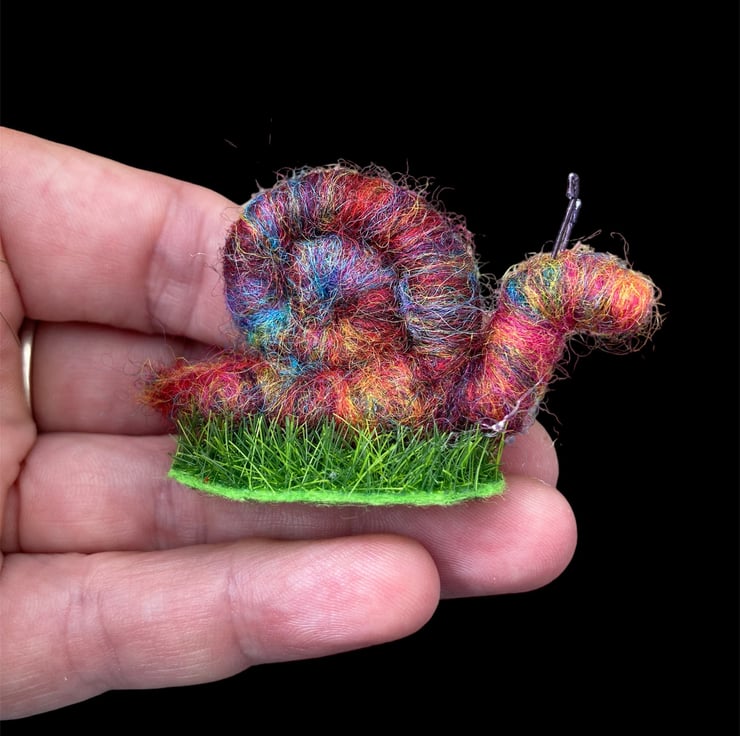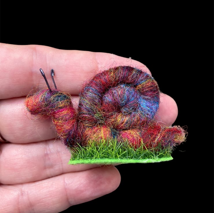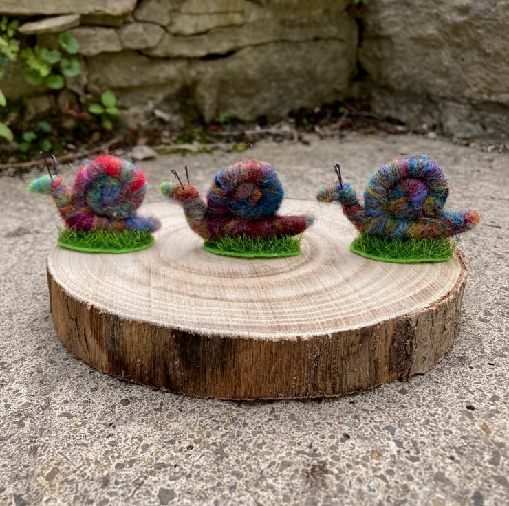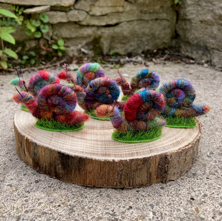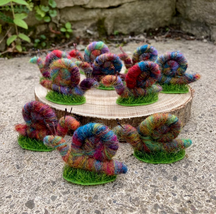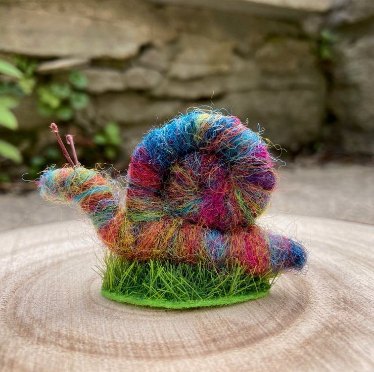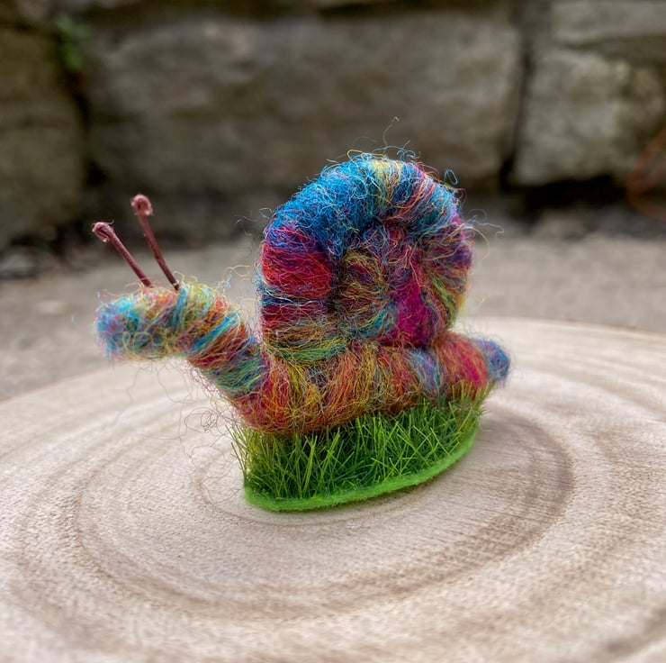 This sweet little mini rainbow snail has been needle felted using woollen fibres. Corriedale fibres in various colours have been blended and then wrapped and needle felted around a wire core. This has then been shaped into the snail with a spiral shell. Small pieces of wire have been used for the antennae and the snail has been mounted on a small oval shaped piece of artificial grass.