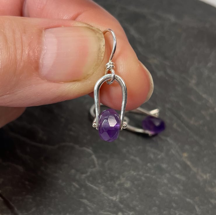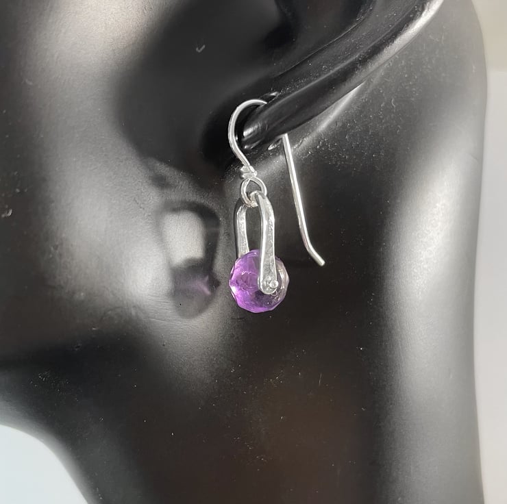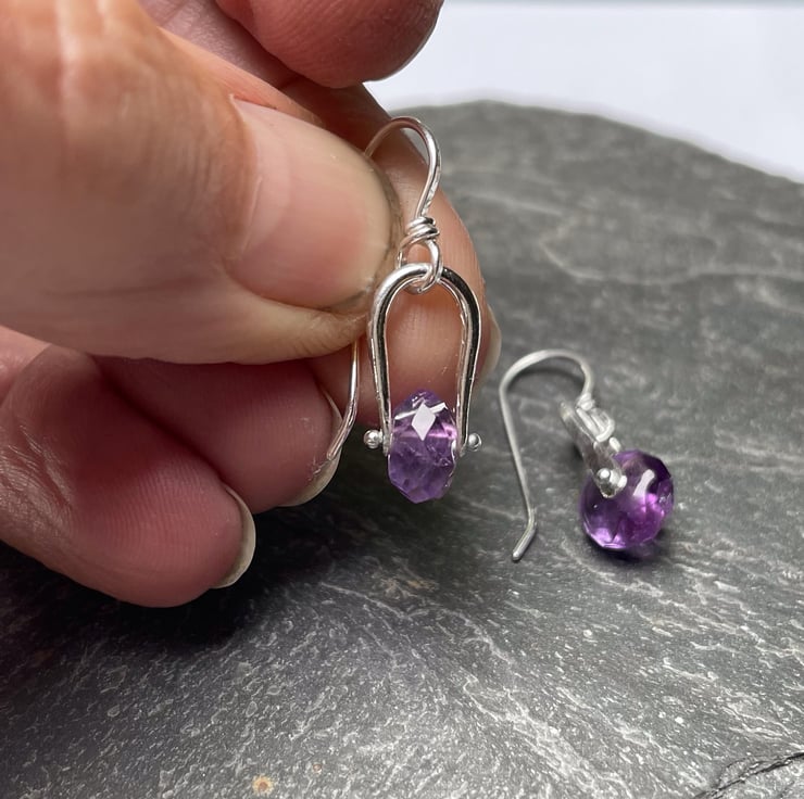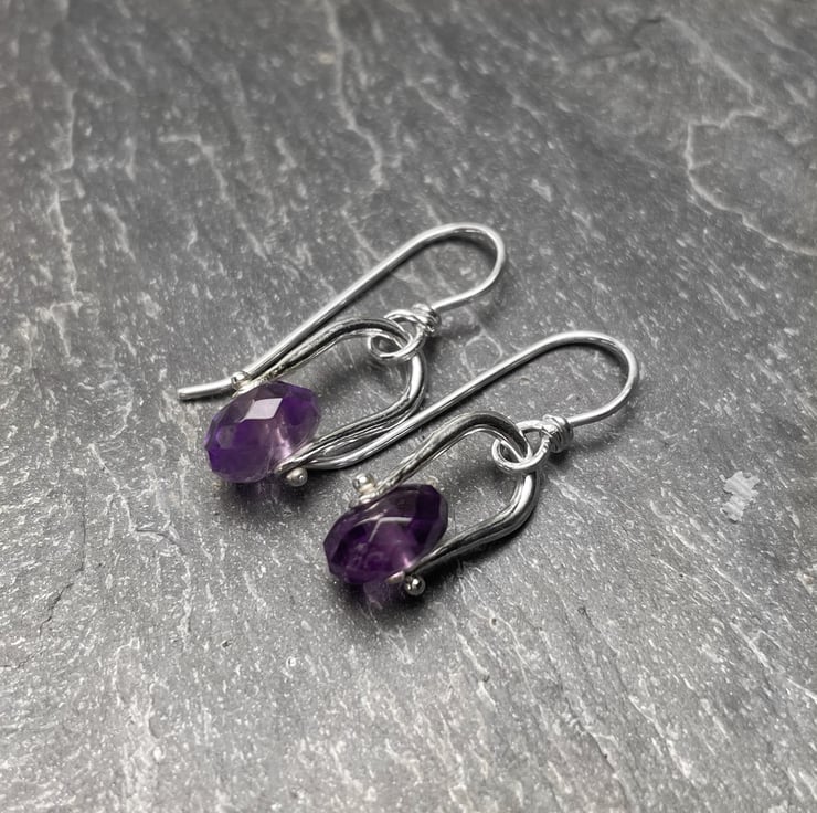 Sterling silver and faceted amethyst small dangly castor like earrings on handmade hooks.