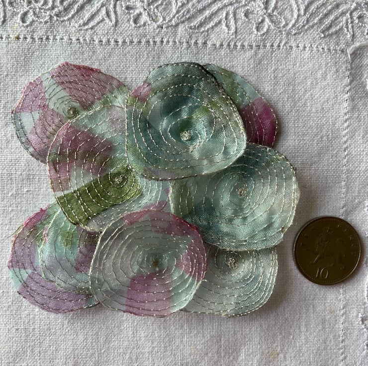 This pack of 9 embellishments have been made by using free motion embroidery techniques - drawing with the sewing machine. Each one is slightly different from another, giving them a quirky and organic look.
